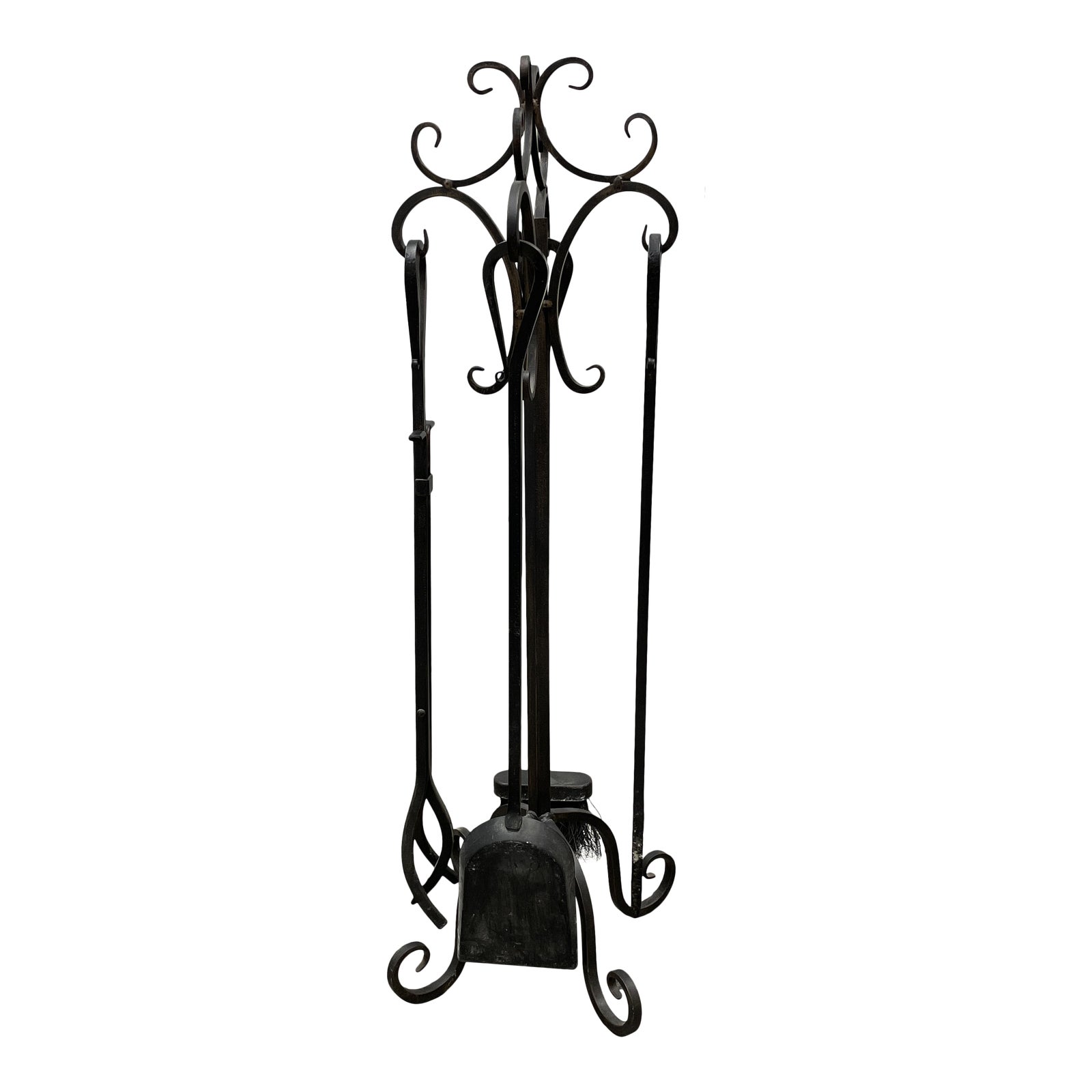 Design Plus Gallery presents a Wrought Iron Fire Tool Set. Black wrought iron is elegantly forged into curved slihouettes. A brush, shovel and two rods hang from curved hooks. Curved footed base emulates the hooks for the tools. Minor wear through out, tool set is in good condition.