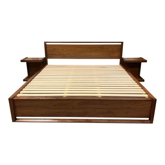 Design Plus Gallery presents an Eastern King Matera Storage Bed Frame. Clean lines nicely finished with beveled edges, running match wood grain and exposed-slot mortise-and-tenon corner joints. All pieces have slotted bases that lend an airy feel. The Matera Bed with Storage has full-extension side drawers that rest off the floor. The finish is Walnut. This bed requires no box spring. Accompanied with a Pair of Matera Nightstands. Designed by Sean Yoo, who was living in Matera Italy at the time, crafted of beautiful Match-wood grain walnut using exposed-slot mortise-and-tenon corner joints. The clean lines are finished with beveled edges and have slotted bases that allow them to “levitate”. Minor wear.