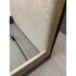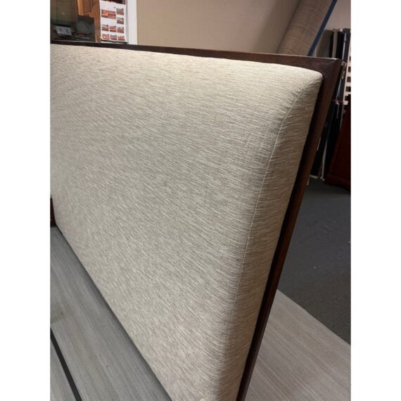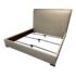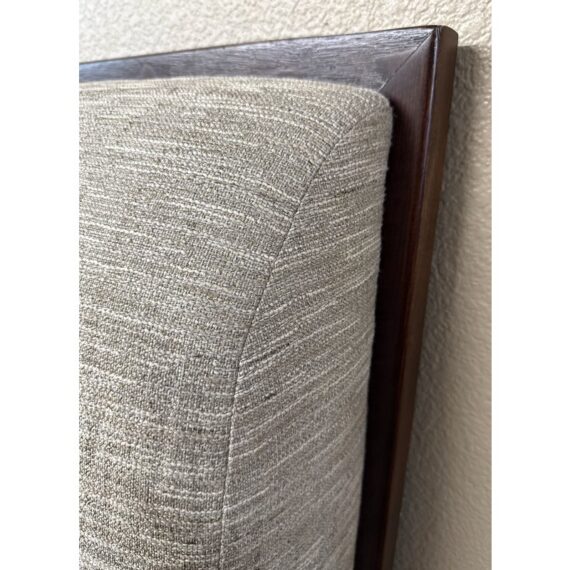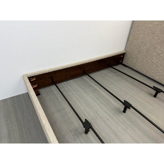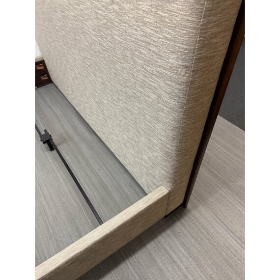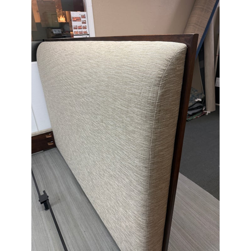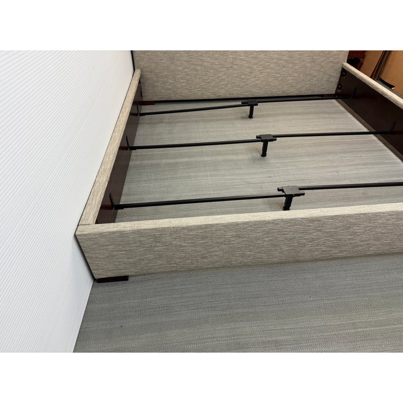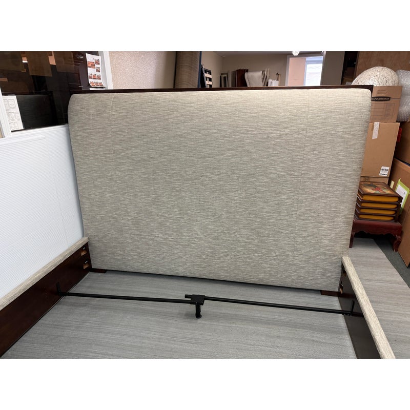 Design Plus Gallery presents an Eastern King Kim Upholstered Bed Frame by Hickory Chair Company. This elegant upholstered bed has a graceful high headboard, upholstered side and foot rails that rest on exposed feet. The deep, luxurious padding, creates an inviting and comfortable resting space. The upholstery is a tight, textured blend of gray, taupe and white. Crafted from American Ash, the headboard features dark-stained exposed wood trim detailing. Showroom sample, condition is good.