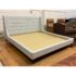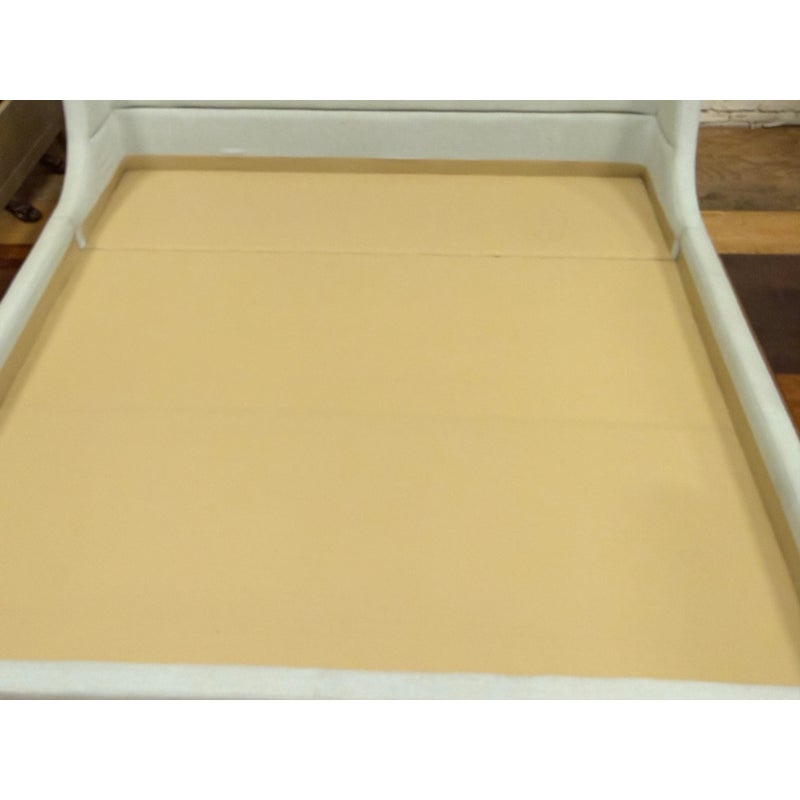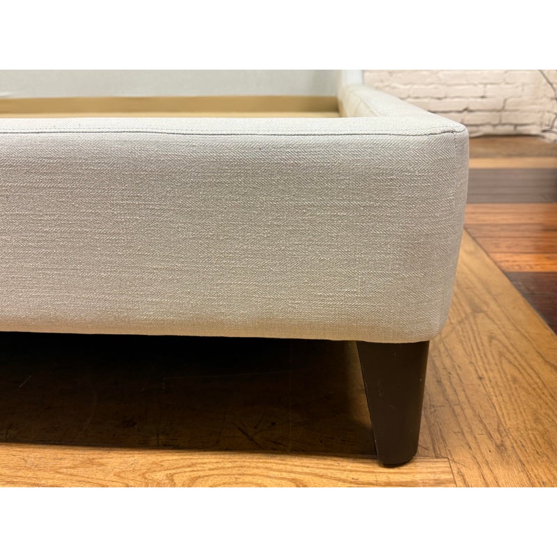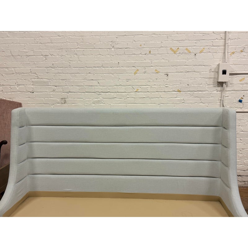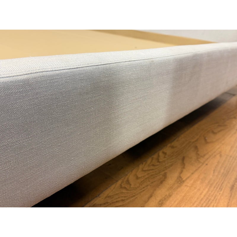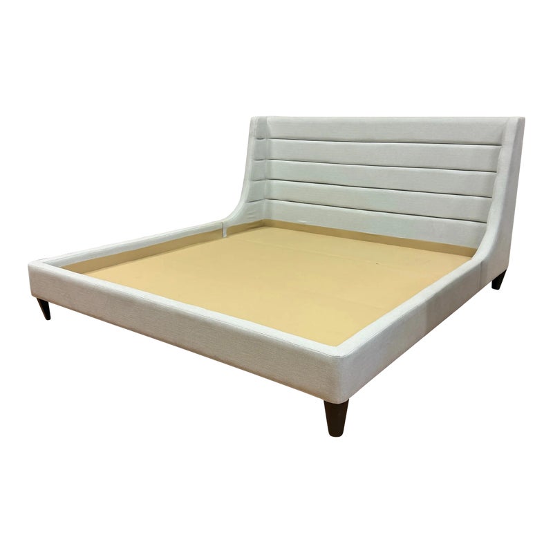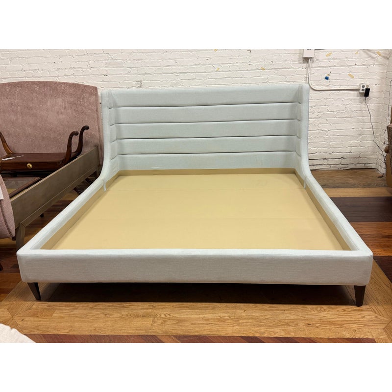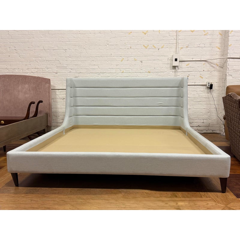 Design Plus Gallery presents the Eastern King Cleo Bed Frame from Lazar Furniture. Modern and chic, the Cleo Bed by Lazar is a well scaled upholstered bed as it boasts a low-profile headboard along with low footboard and matching height rails and is made for a mattress only. The headboard is tall which reckons with a commanding profile. There are horizontal channels across its surface to add subtle texture and visual interest. Upholstered in a light gray fabric making it a versatile piece that can complement a variety of décor styles. In good condition, visible markings on the platform. and minimal wear form usage. Made in the USA.
