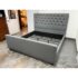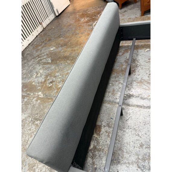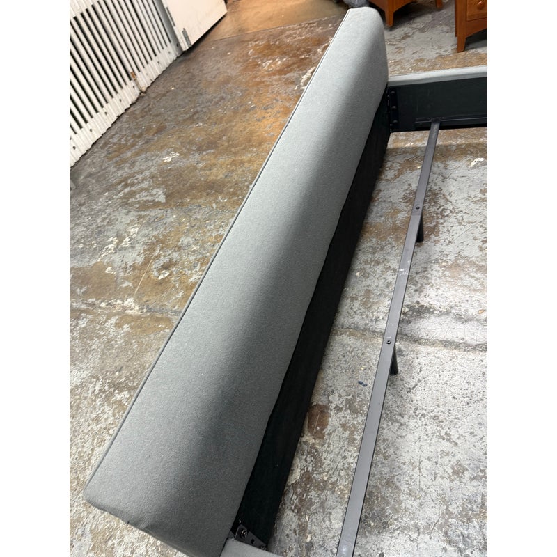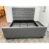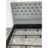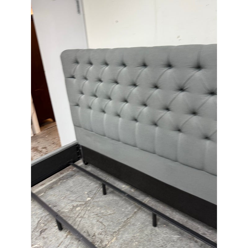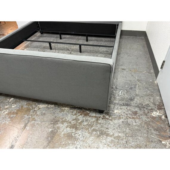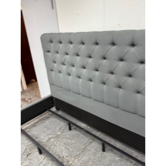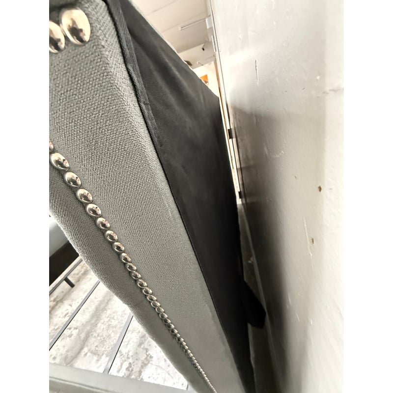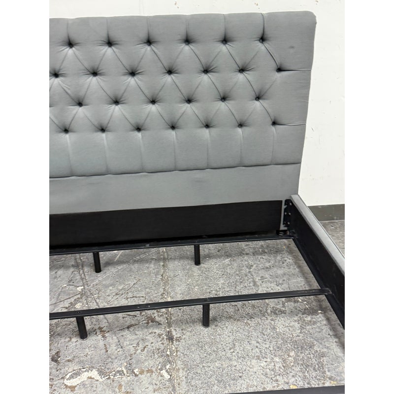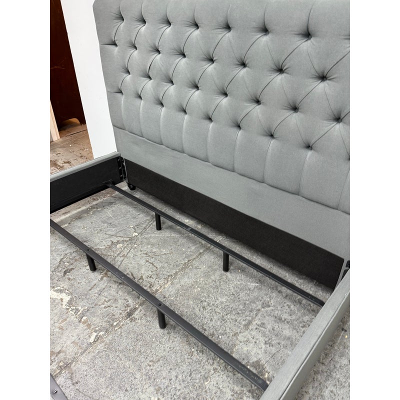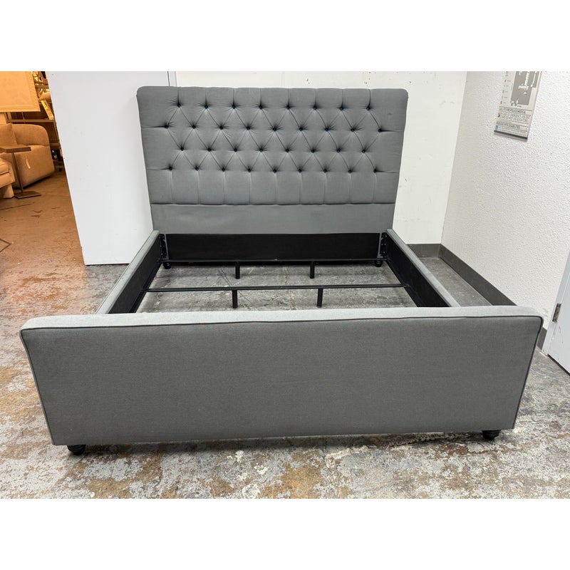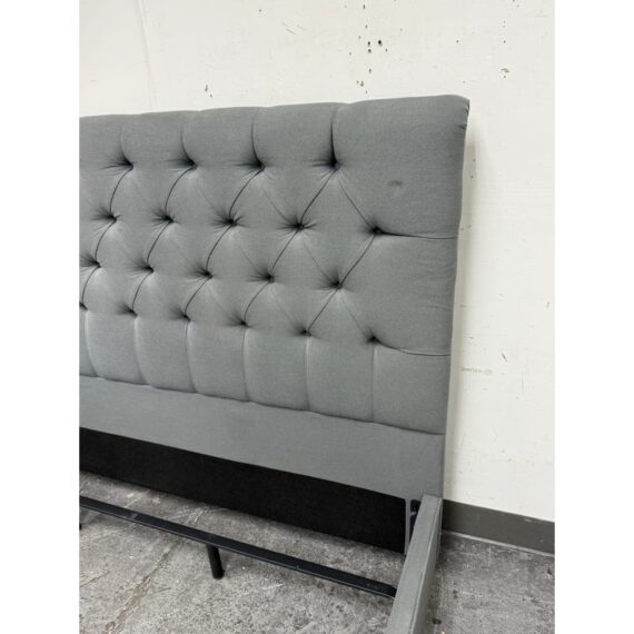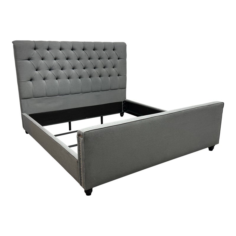 Design Plus Gallery presents a Grey Tufted Bed Frame from Living Spaces. The elegant bed frame is entirely upholstered in a grey microfiber suede fabric with nailhead trim. The frame is good condition with minimal wear for its usage.
