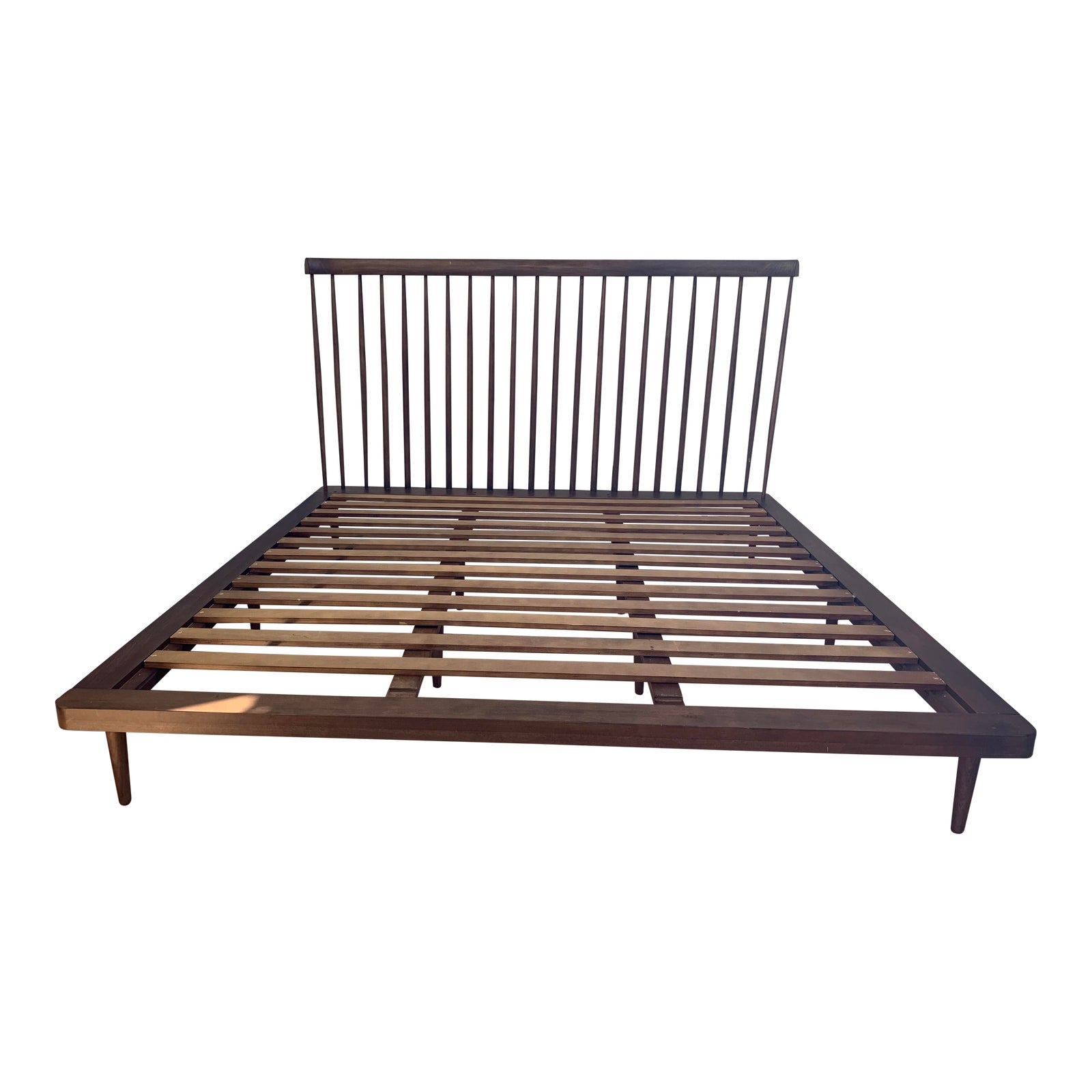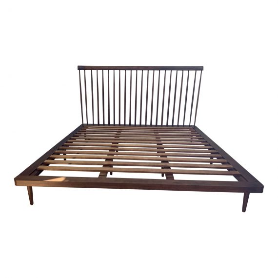 Design Plus Gallery presents a King Nuevo Living Jessika Walnut Bed Frame. Solid Poplar American wood is stained walnut with shaker style dowel construction. Simple platform base has mid-century style tapered legs. Minor wear on frame.