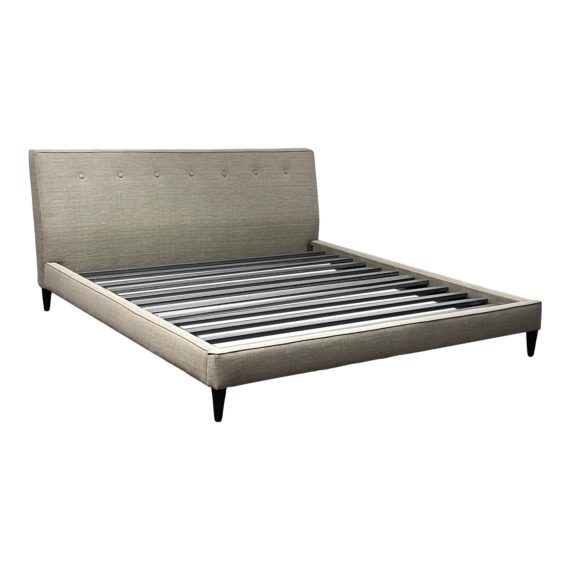 Design Plus Gallery presents the Hoffman King Bed Frame from Room and Board. The Hoffman features the timeless details of mid-century design with a smartly tailored frame, precise welting and button tufting. The slightly angled headboard provides a comfortable spot to lounge, while durable woven fabric adds texture. No boxspring required! In good condition with minor surface wear that is consistent with age + use. Made in USA.