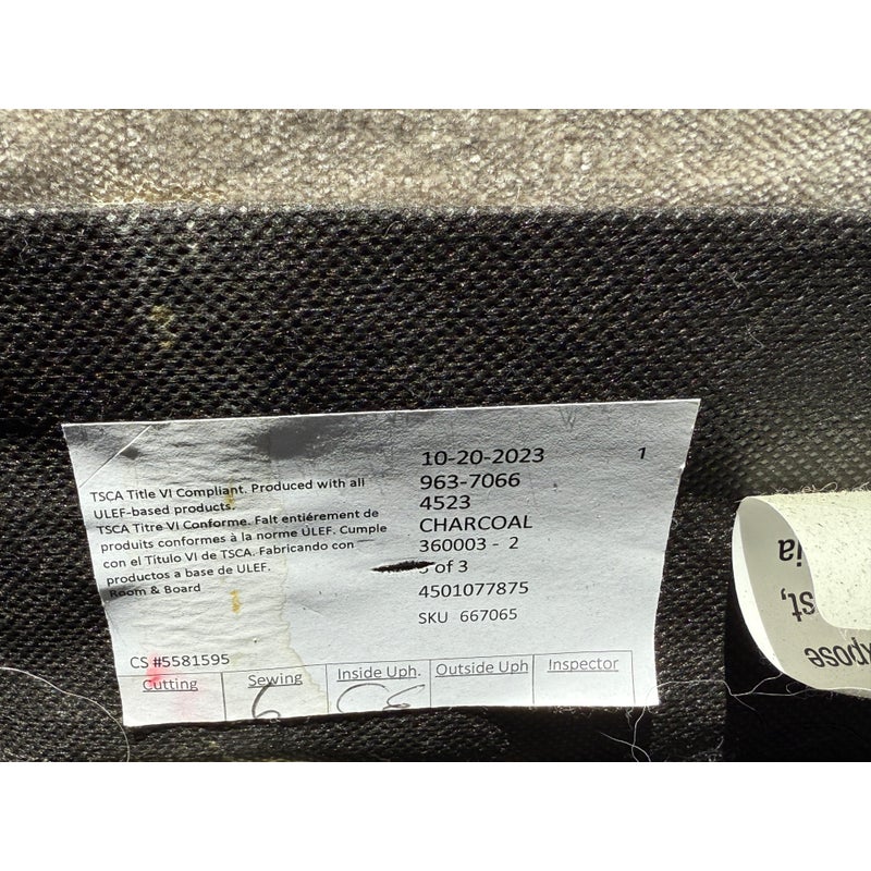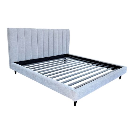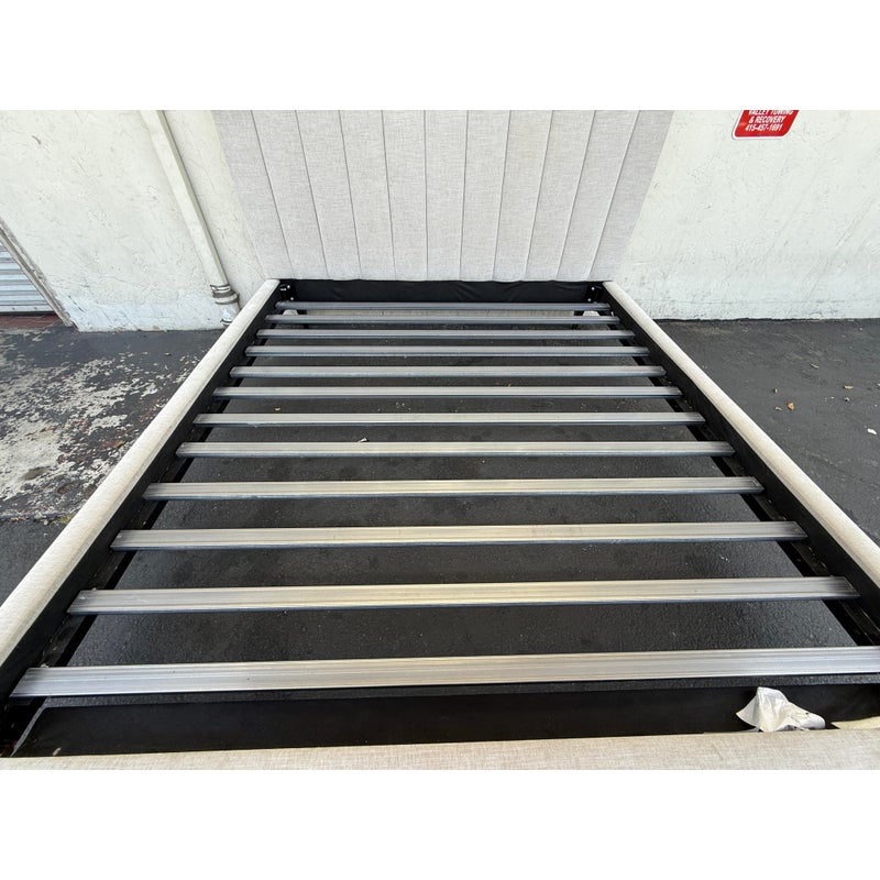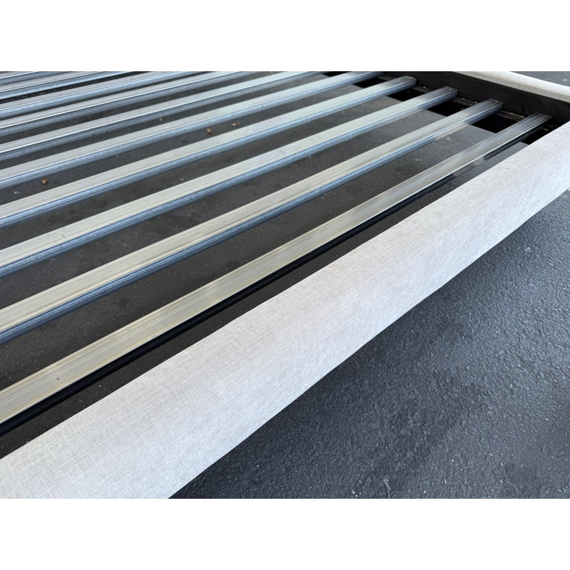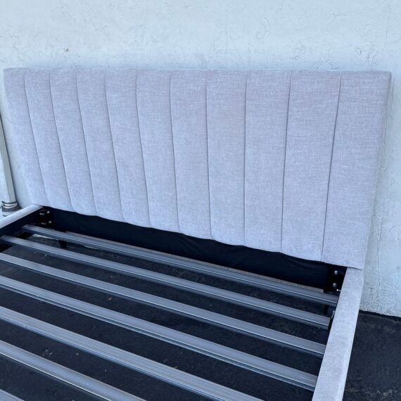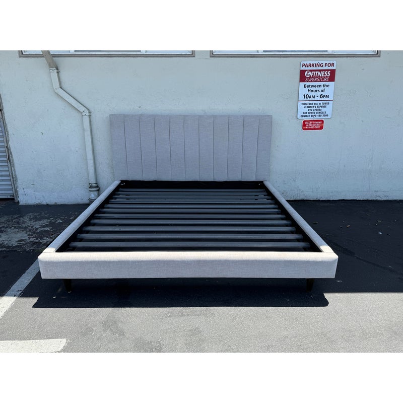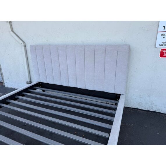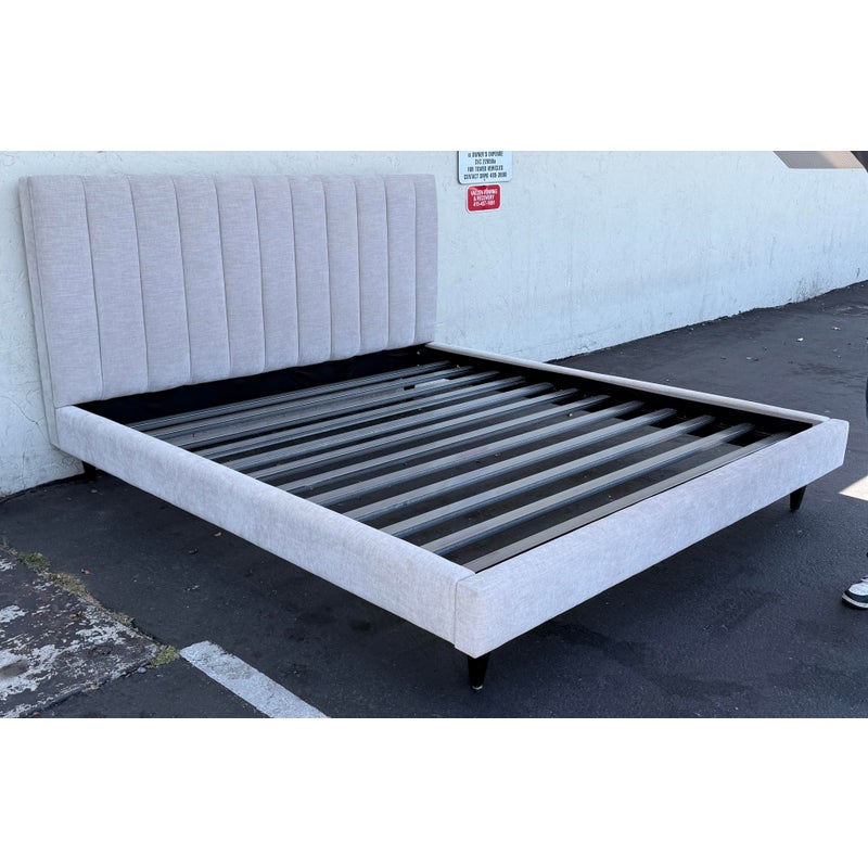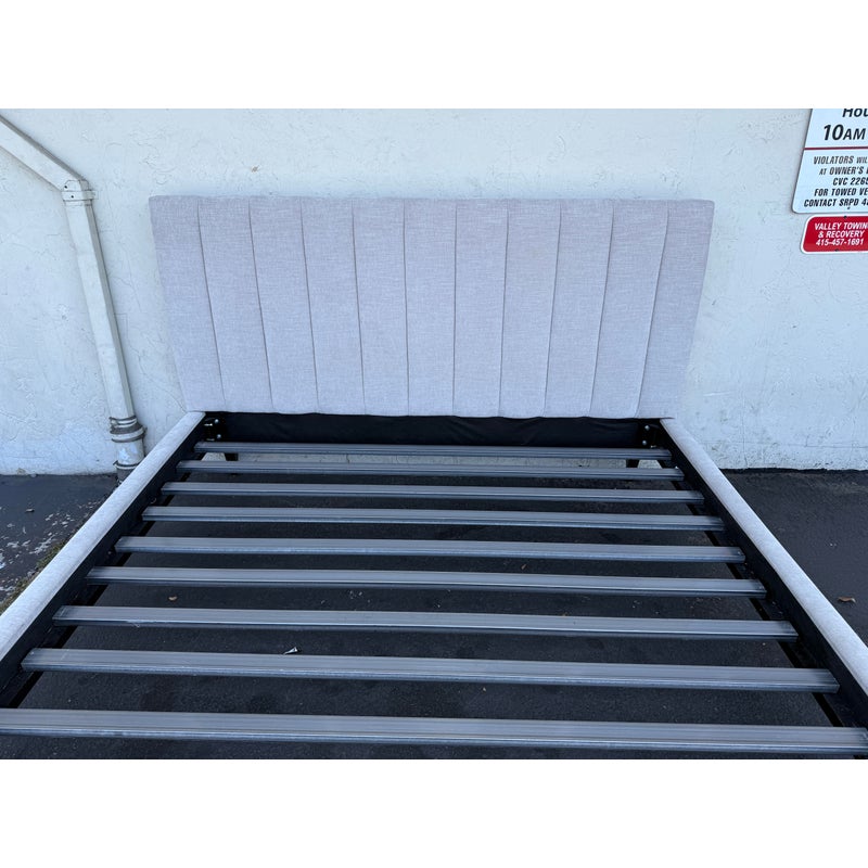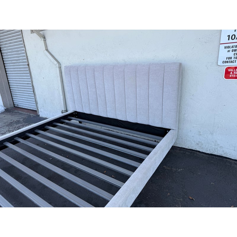 Design Plus Gallery presents an Eastern King Hartley Bed Frame from Room & Board. The headboard is channel tufted in soft oatmeal upholstery and is a neutral foundation for the bedroom. Although not a platform bed the frame does seem to hover over the ground with its barely visible legs posts. Light wear; condition is good for age and use.