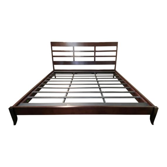 Design Plus Gallery presents a Eastern King Size Dakota Jackson Platform Bed. Espresso wood stain is satin finished with the open slat bed frame. Comes with wood slat support and optional plywood board. Minor were on surfaces.
