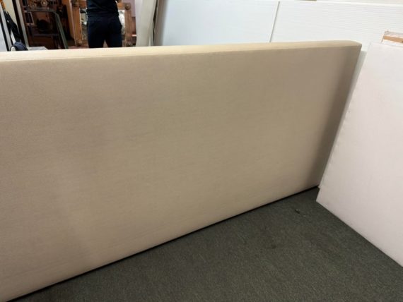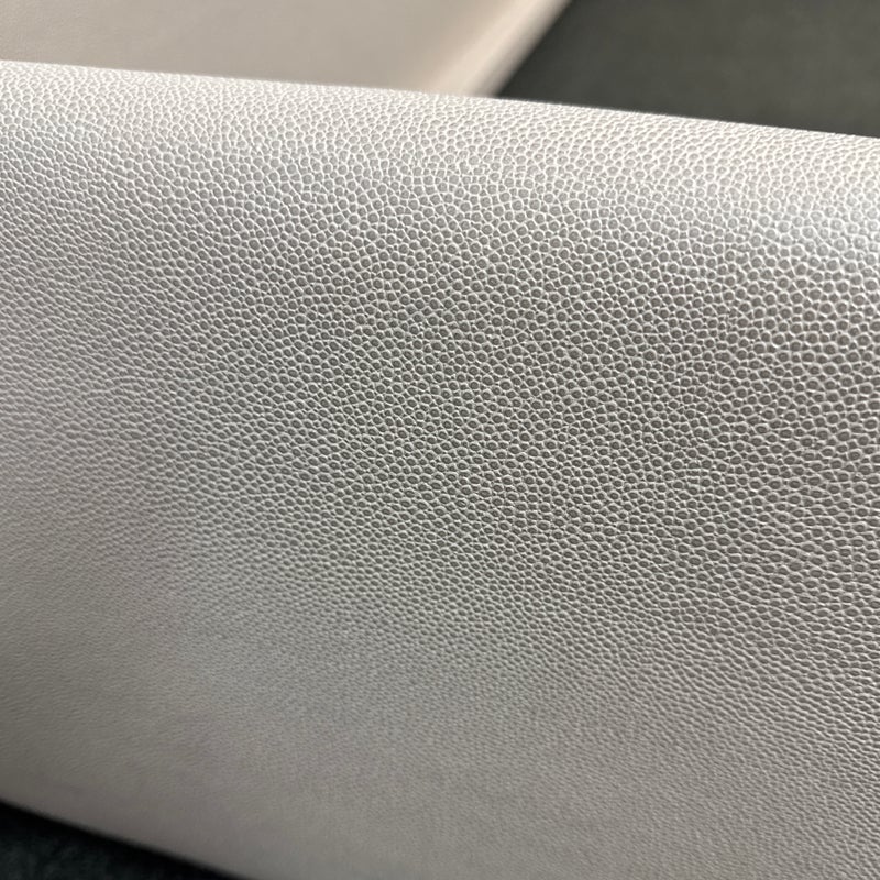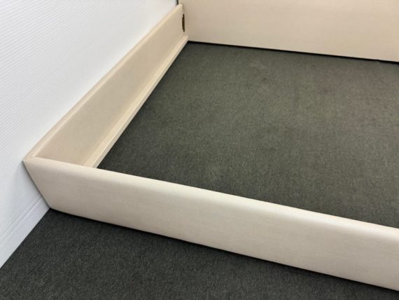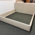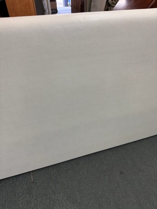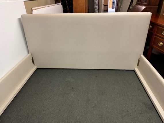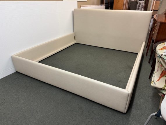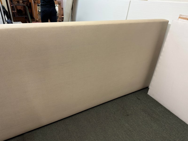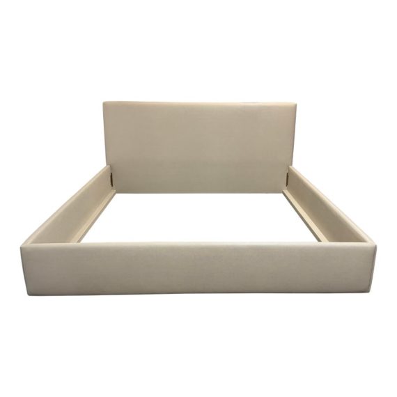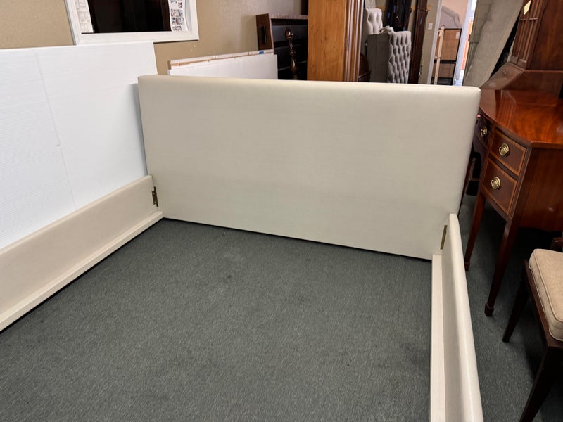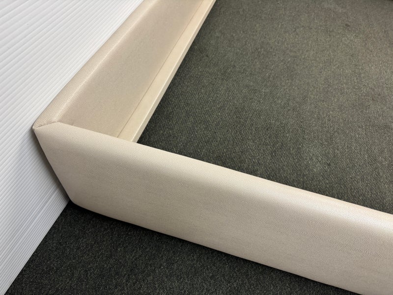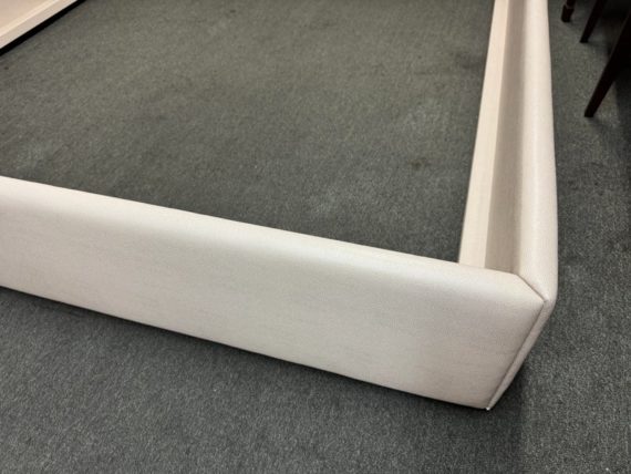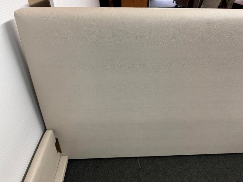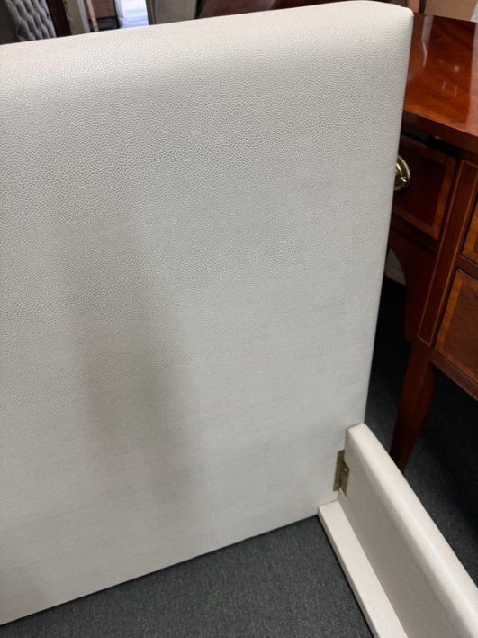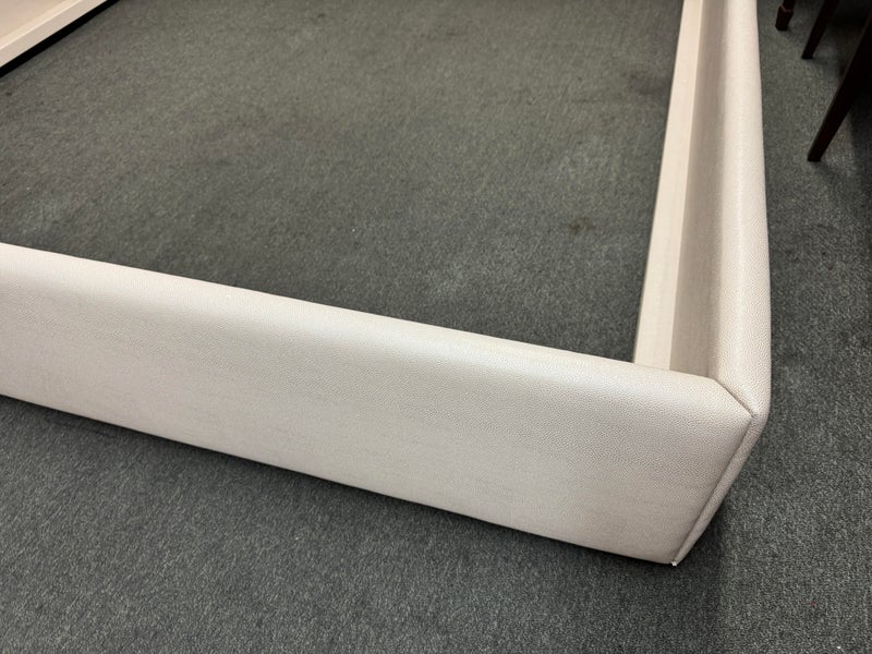 Design Plus Gallery presents a Thomas Pheasant designed Bedframe for Baker Furniture The simple silhouette is modern and minimal, and works beautifully with your adjustable bed. Fully upholstered in shagreen textured off white leather, the bed stands out for its simple elegance. Does not come with slats. Little evidence of wear; condition is good.