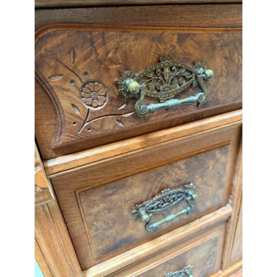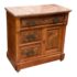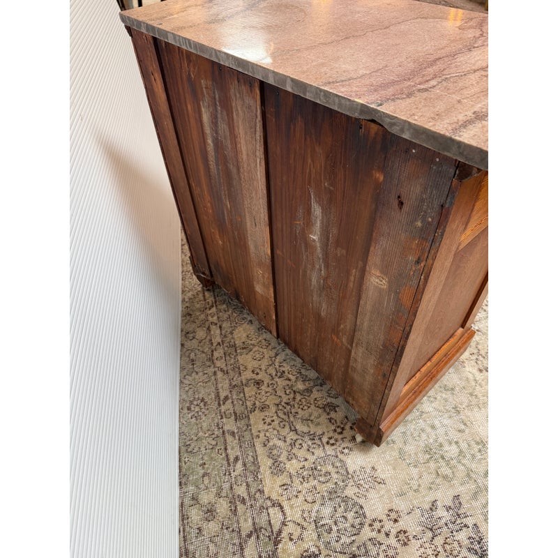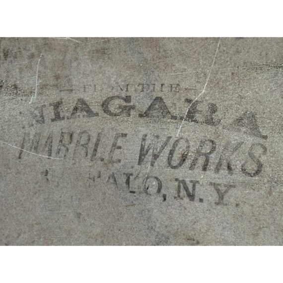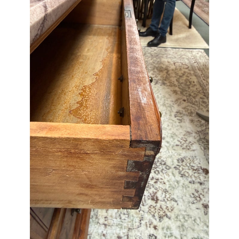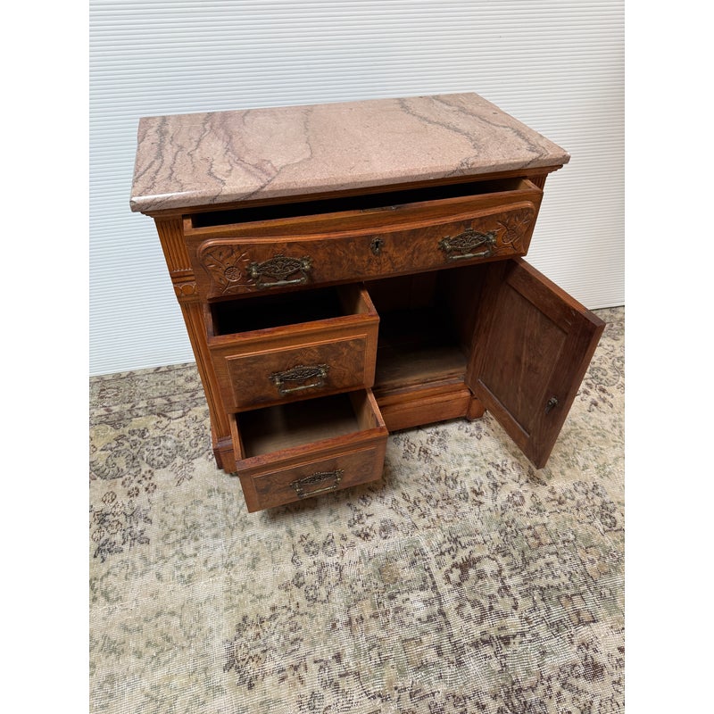 Design Plus Gallery presents a Washstand from the Late 19th Century. This commode, or washstand, is made from walnut wood with a marble top from Niagara Marble Works. The wooden commode has three drawers and a cabinet door with empty cavity space. The marble top fits right on top that protects the wood from water staining and wear. The piece is in good condition for its antique age + use.