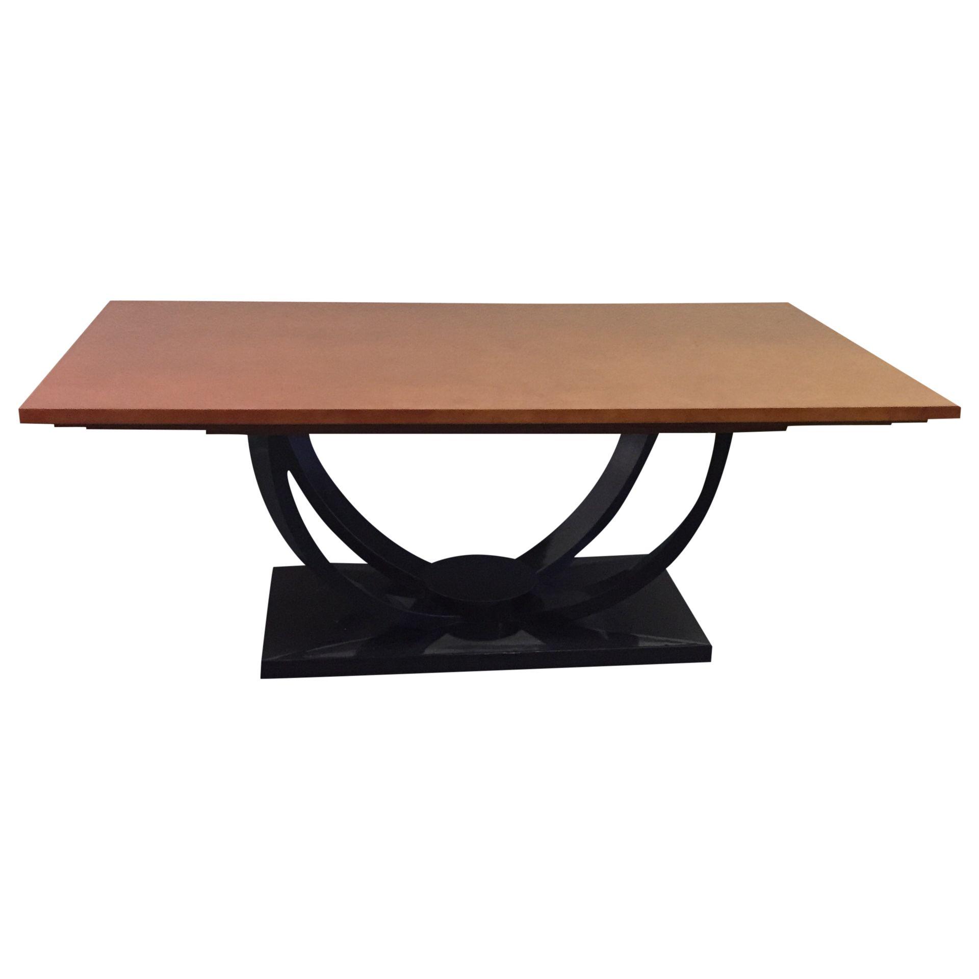 An elegant custom pedestal foyer table featuring a curved, ebony wood base and a beautiful birdseye maple top. This foyer table is the perfect sculptural centerpiece for a modern classic, Hollywood Regency style dining room!