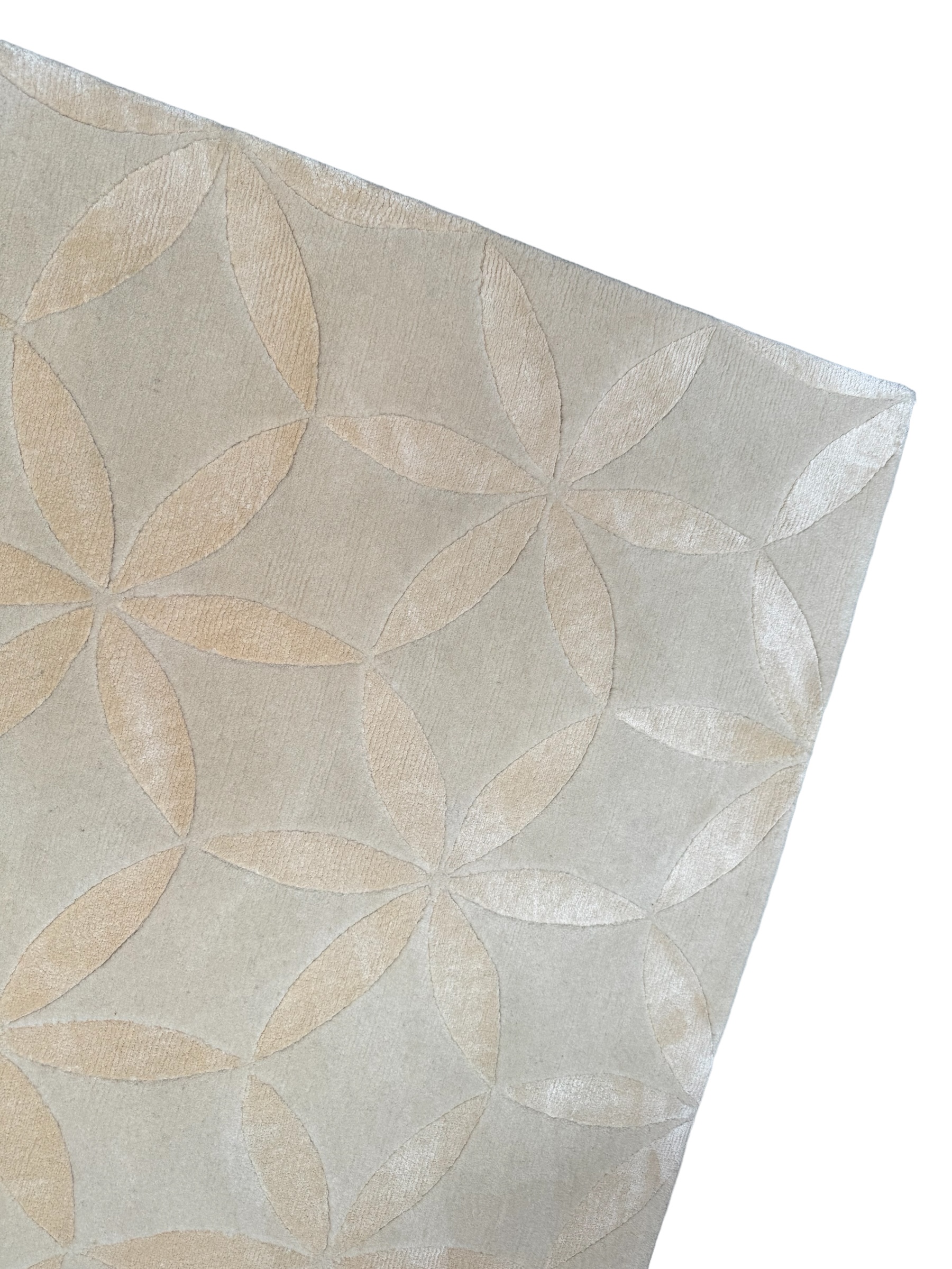 Design Plus Gallery presents the 8ft x 9ft 8in Starflower Hand-Knotted Rug in Wool + Silk by Edward Barber & Jay Osgerby. Starflower is derived from a classical geometric pattern previously employed by the designers as a ceramic 3D tile, but transformed using color, tone and texture into a 2D design. This tonal version of the design has a silk motif on a wool background. Hand-knotted Tibetan wool and silk. Is in good condition with minimal signs of wear.