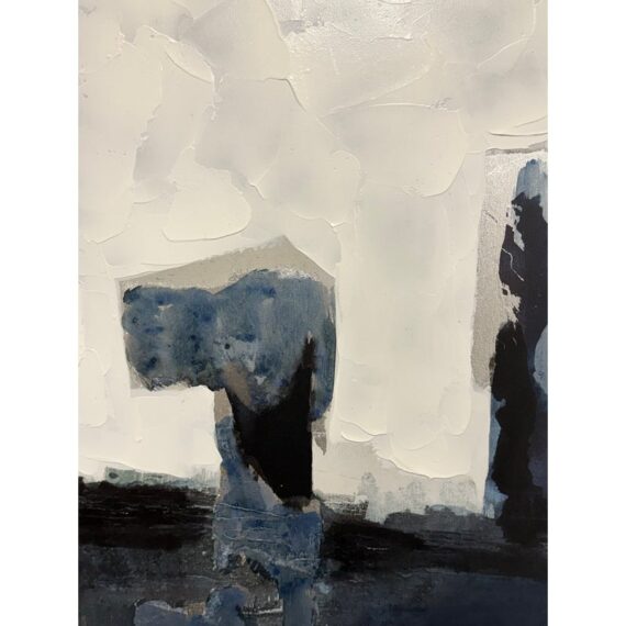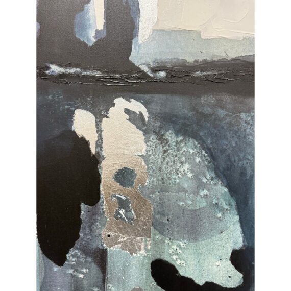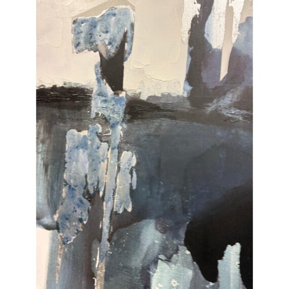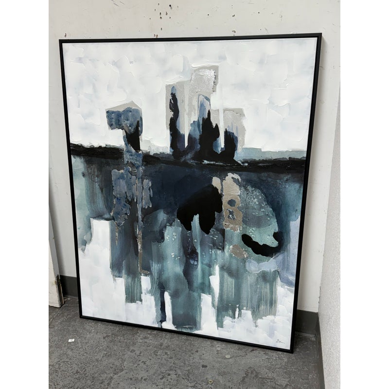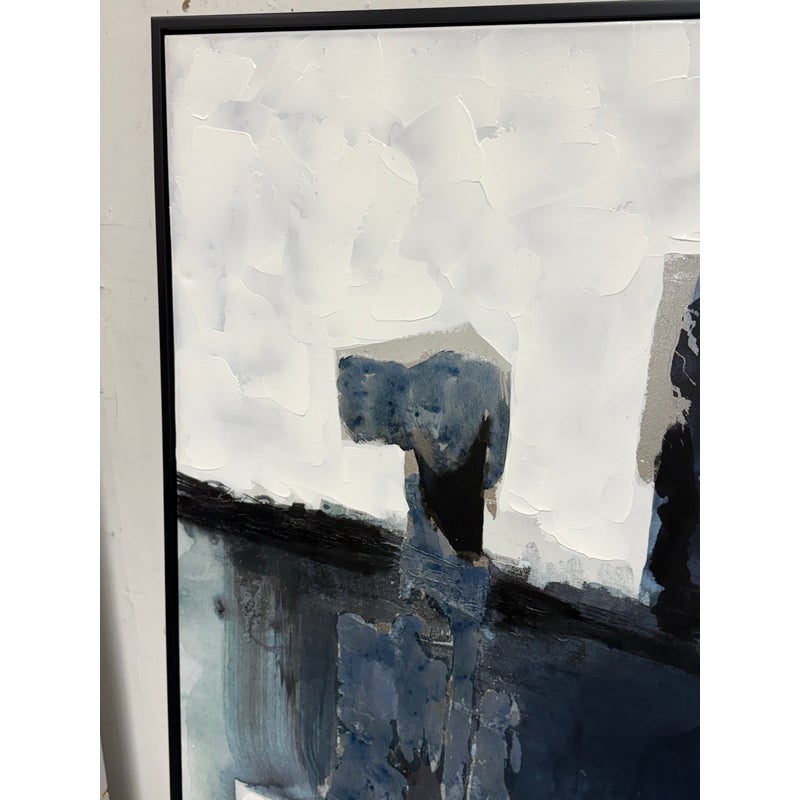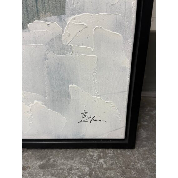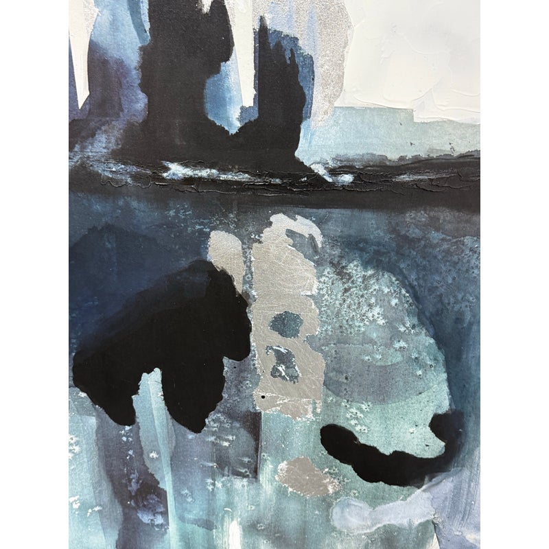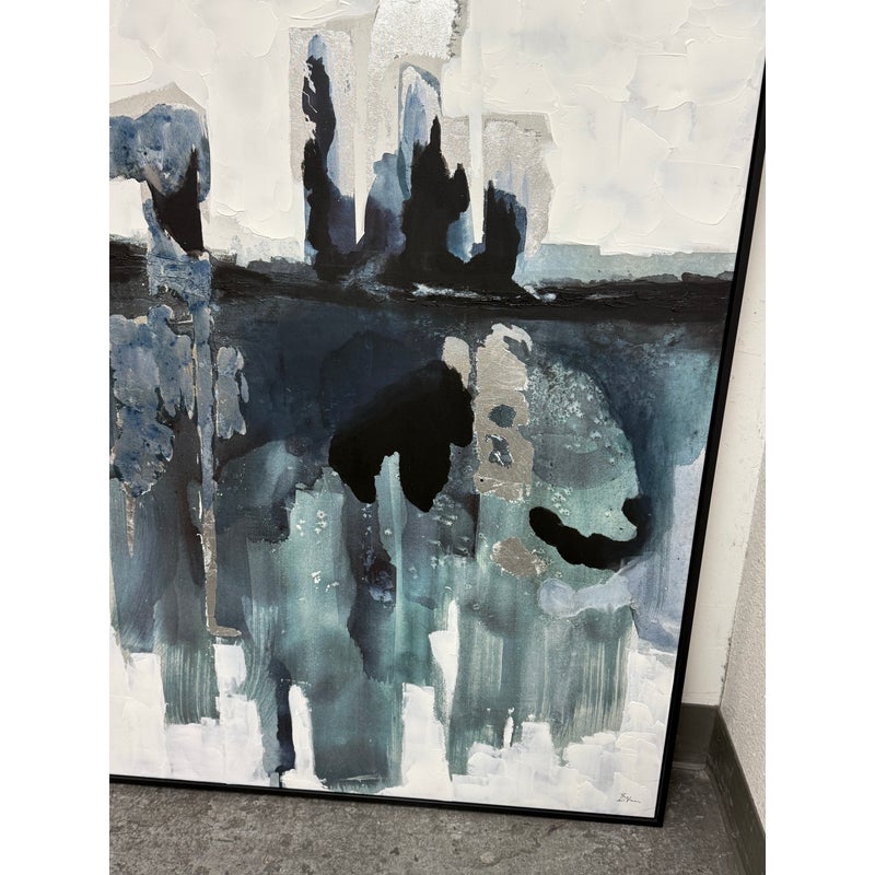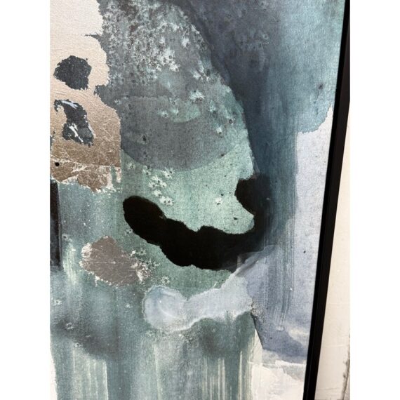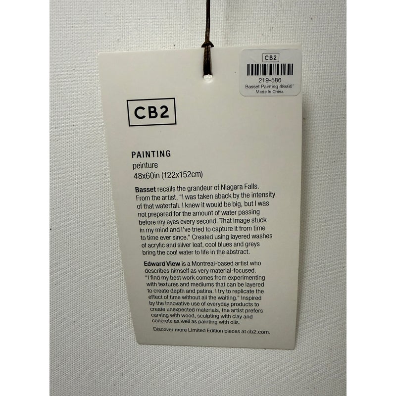 Design Plus Gallery presents the Bassett Art Print from CB2 by Edward View. In this art piece, the artist recalls the grandeur of Niagara Falls who had been taken aback by the intensity of that waterfall. The image of the intensity of its rushing water has stuck his my mind and he has tried to capture it from time-to-time ever since. Bassett was created by using layered washes of acrylic and silver leaf, cool blues and greys bring the cool water to life in the abstract. CB2 offered this piece as limited supply and is no longer in production with the brand. It is encased in a thin black frame with minimal visible surface wear for its usage.