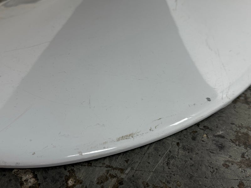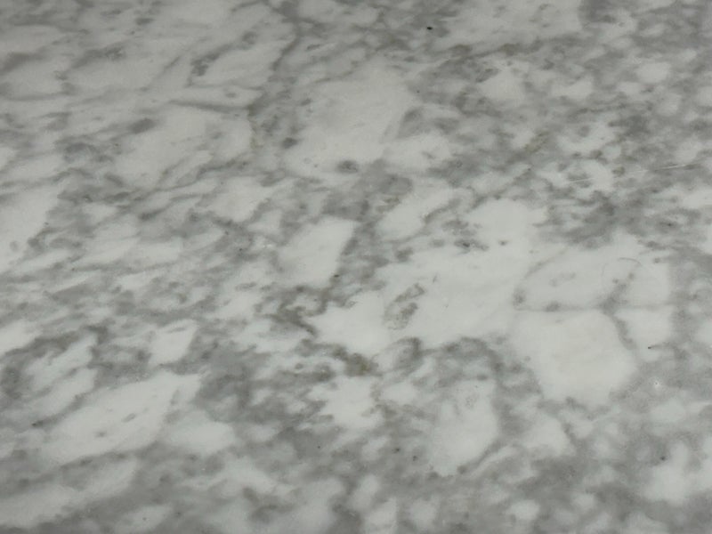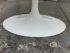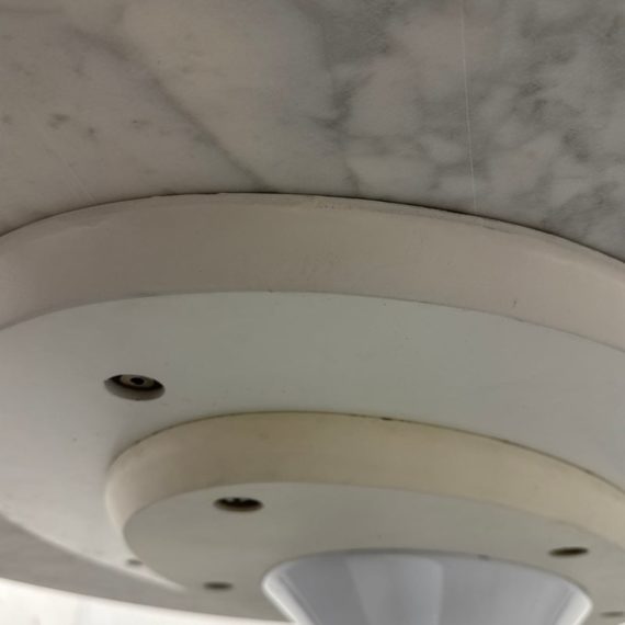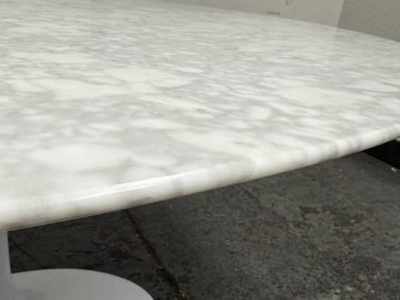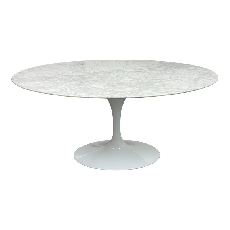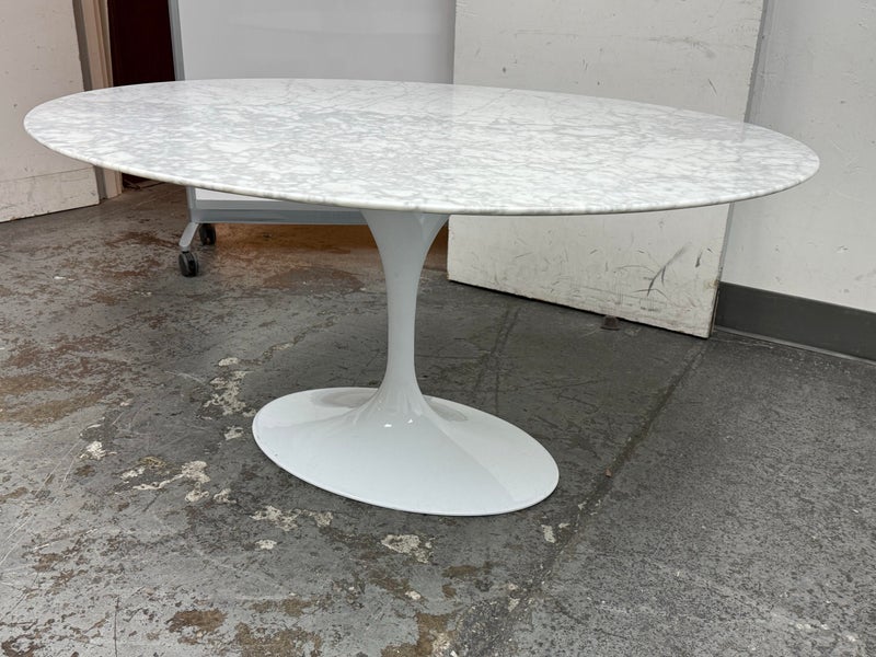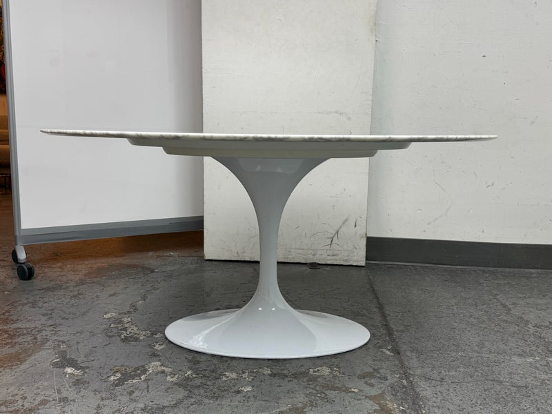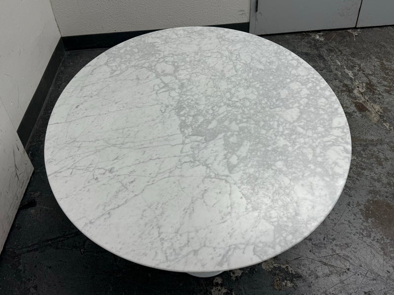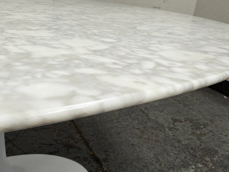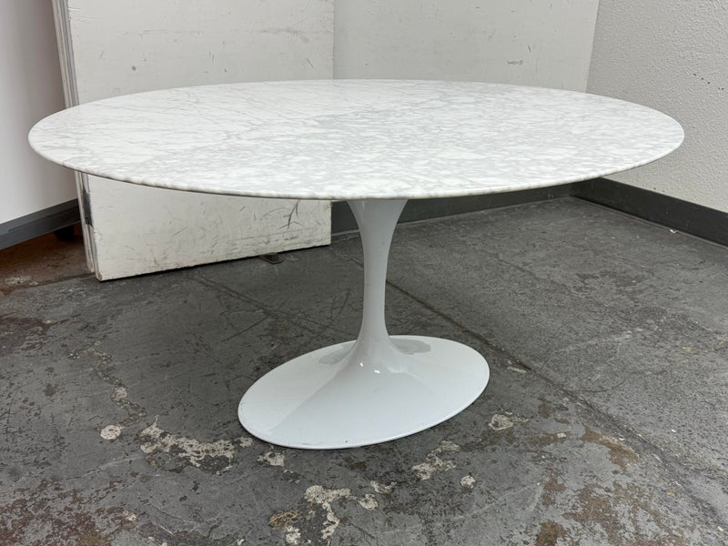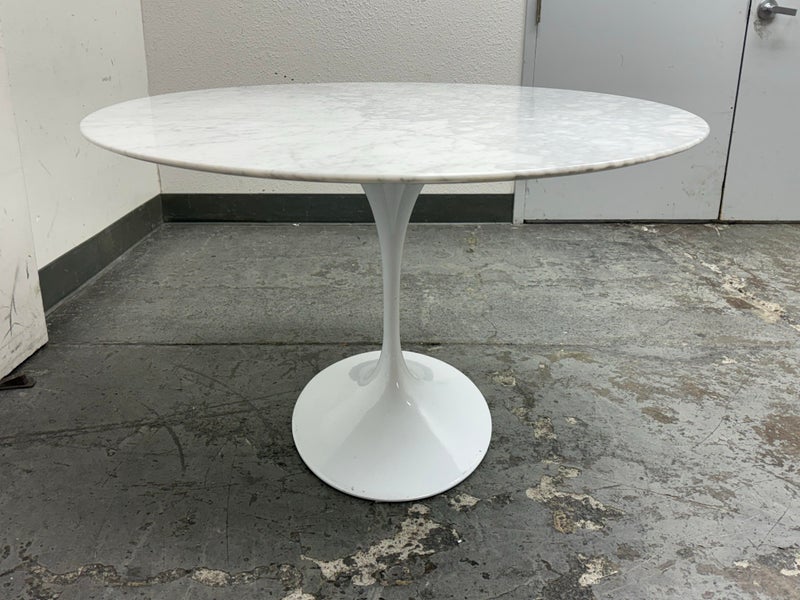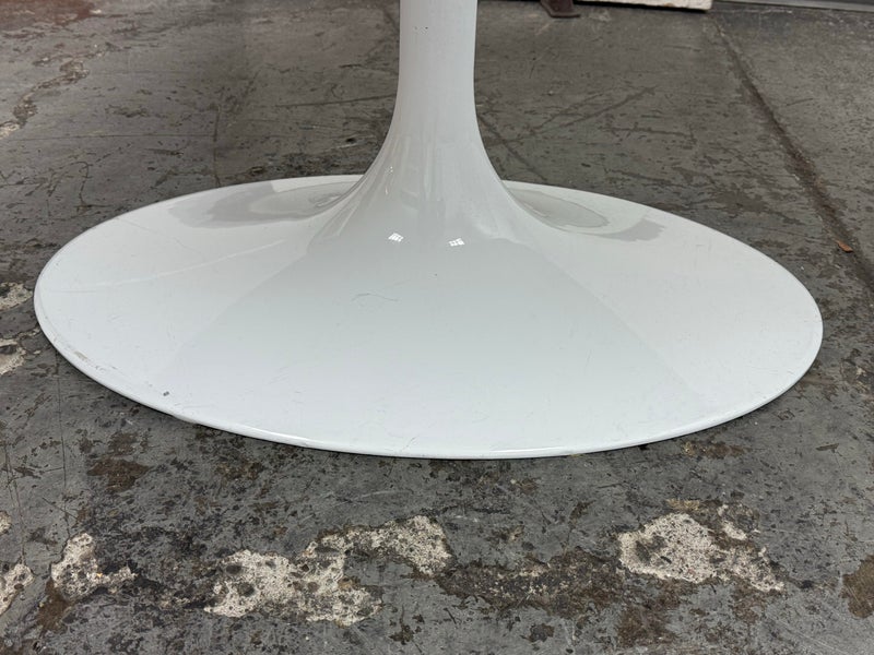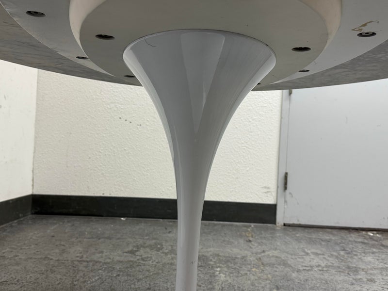 Design Plus Gallery presents a Tulip Dining Table in the Eero Saarinen Style. There is a white powder coated base of crisp white with a marble table top. The surface has beautiful gray and white tones. There is some visible wear to the base that is consistent with usage.