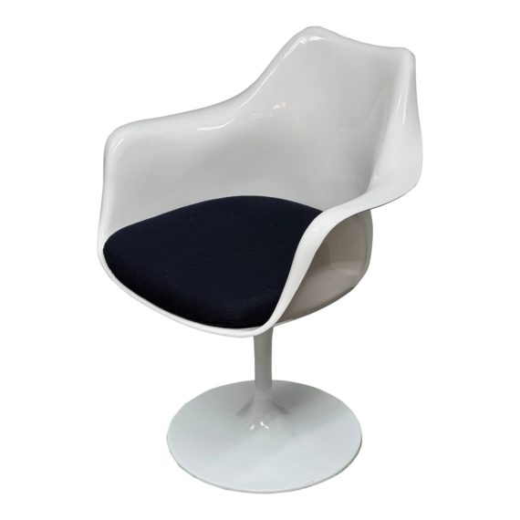 Design Plus Gallery presents a Tulip Arm Chair in the Eero Saarinen Style. The white molded plastic shell perfectly contours to your bodies curves and keep you seated comfortably. Outfitted with a navy seat cushion. Whether used around a dining table or at a desk this chair will delight you, your guests, and invoke ooo’s and ahhh’s for its formidable high design style. Is in good condition with minimal signs of wear.