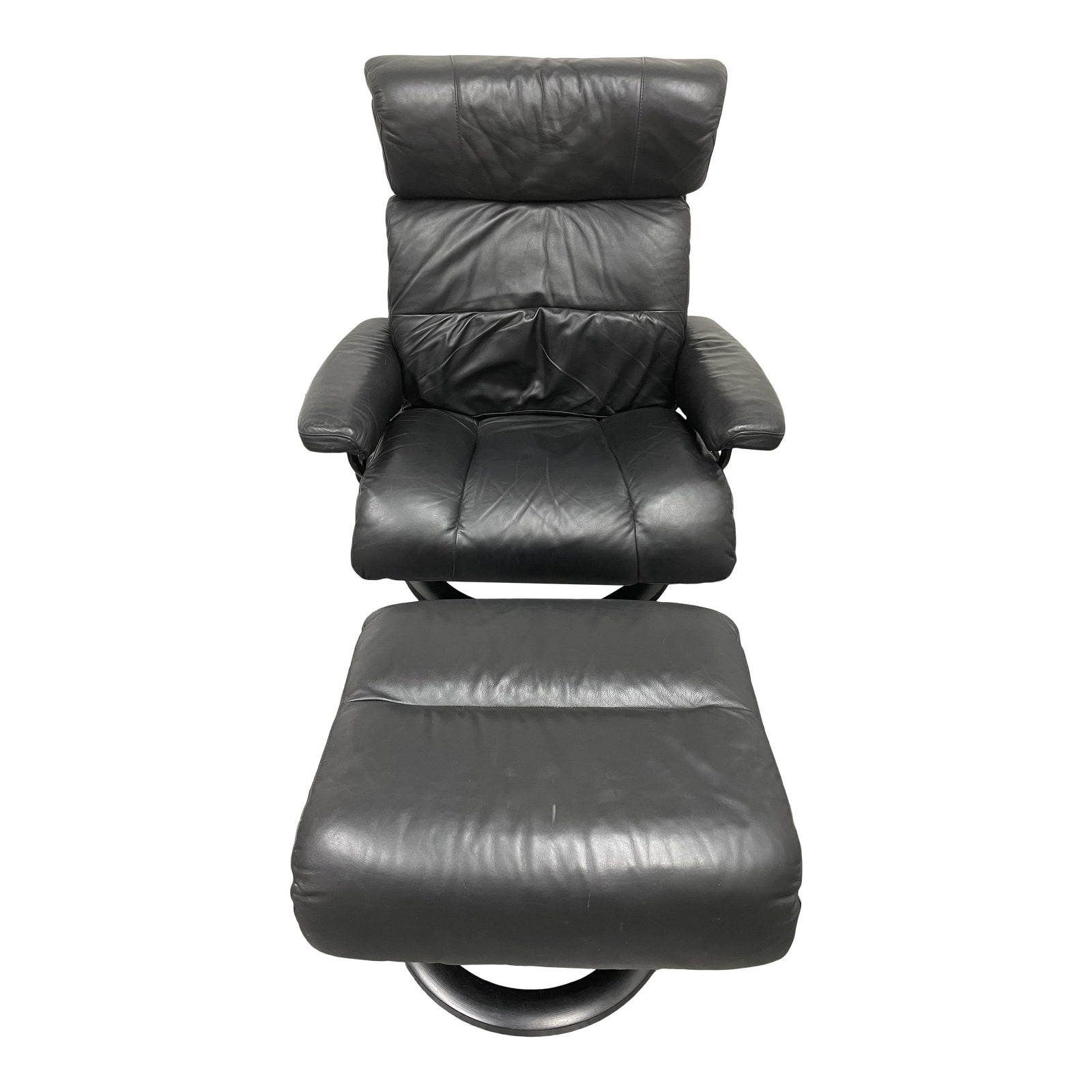 Design Plus Gallery presents a Late 20th Century Ekornes Black Leather Arm Chair + Ottoman. Ergonomic seating experience here with easy to blend and maintain black leather. Leather shows some wear from usage, recliner and ottoman are in good condition. Wood base is treated a tonal satin black. Made in Norway.