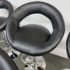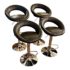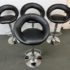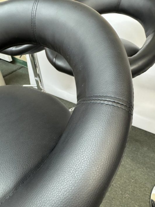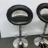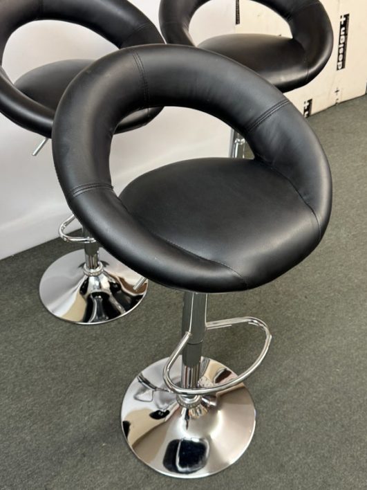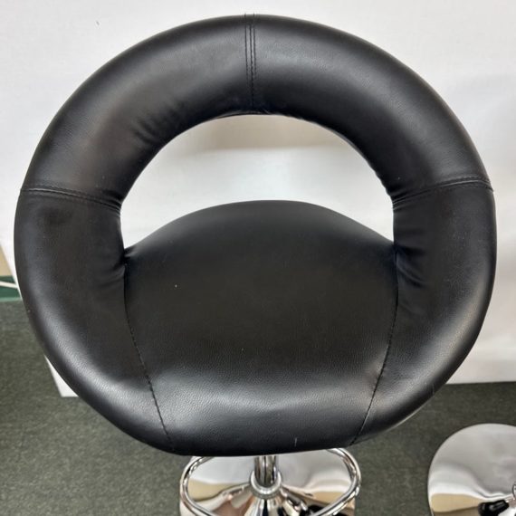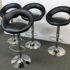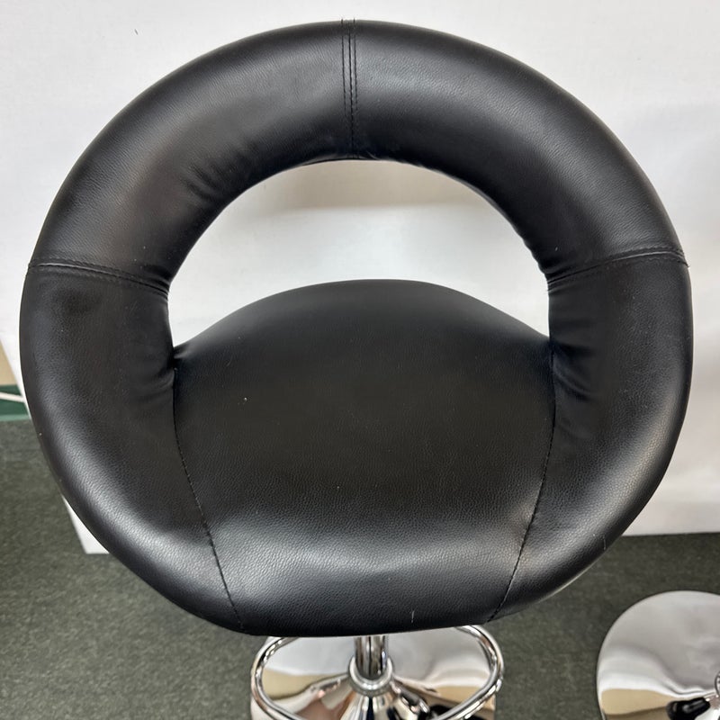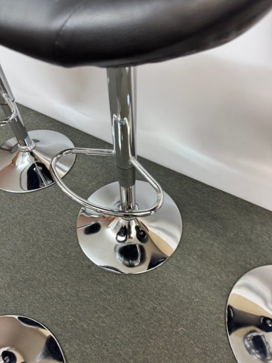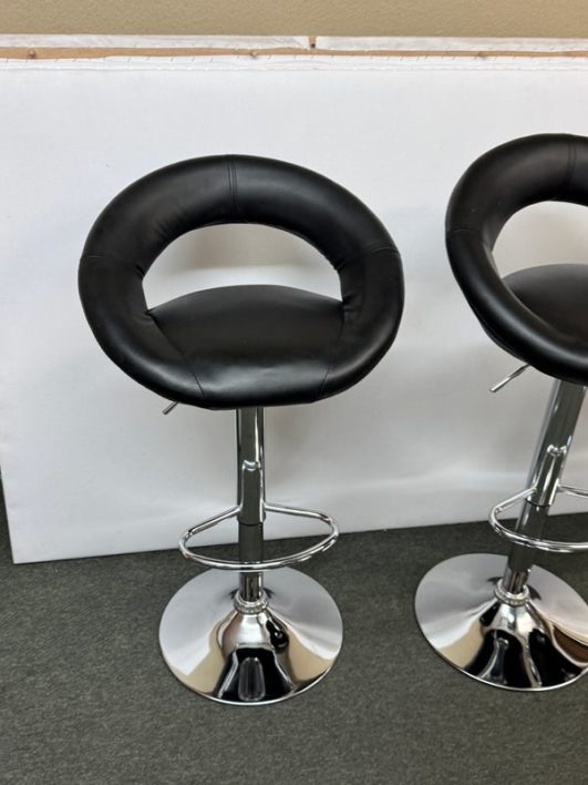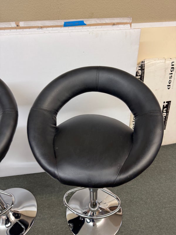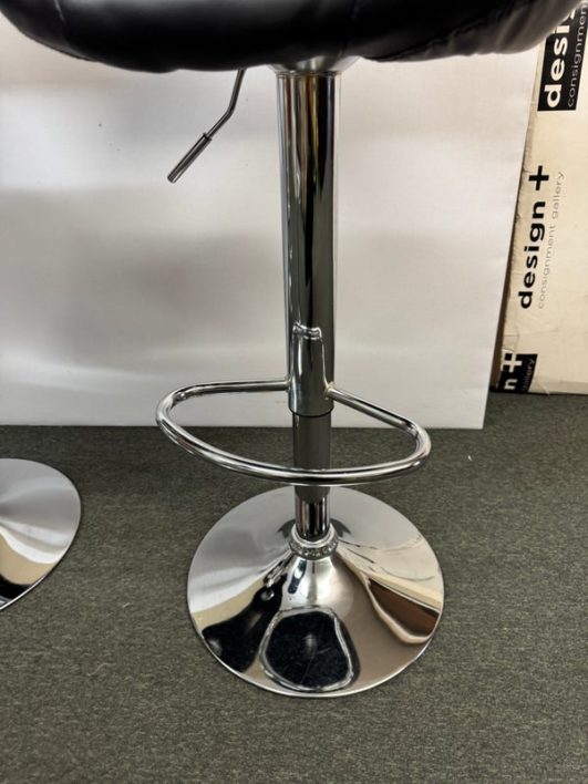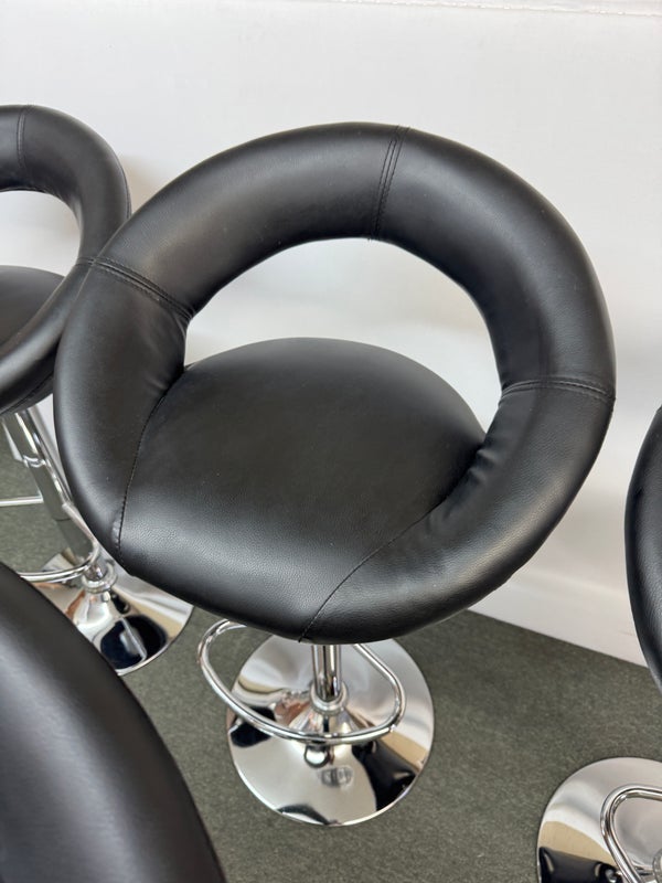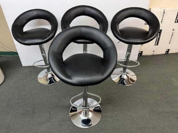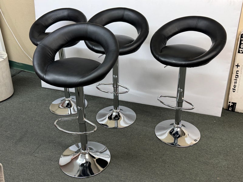 Design Plus Gallery presents a Set of 4 Elama Barstools. The faux leather stools, adjustable from counter height to bar height, have a modern silhouette with chrome features. Light surface wear; condition is consistent with age and use.
