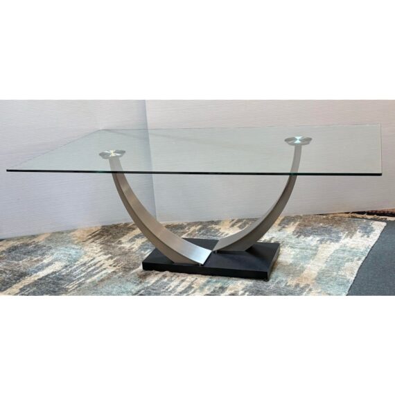 Design Plus Gallery presents a Dining Table from Elite Modern. This tape design is influenced from the Post Modern, late 20th century, movement in furniture. During that era of style furnishings were created with sculptural influences with modern materials. The base is mainly made of metal that offers two swooping bases to reach upwards to hold onto the tempered glass surface. The piece is in good condition overall with minor visible wear from usage.