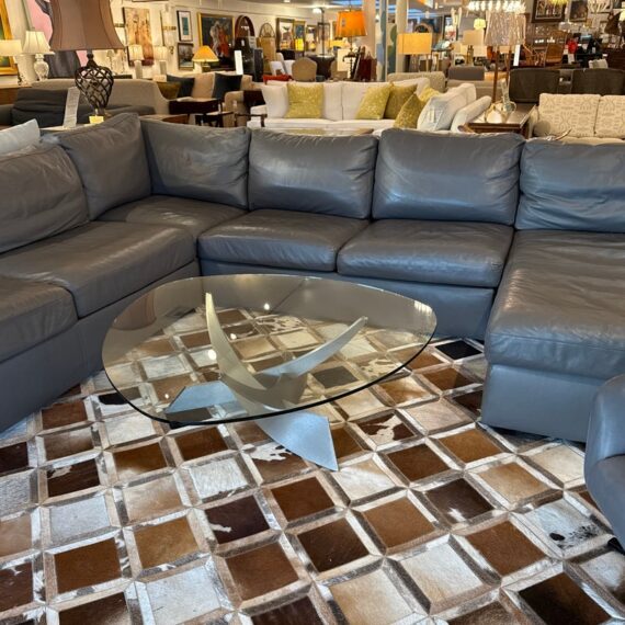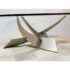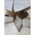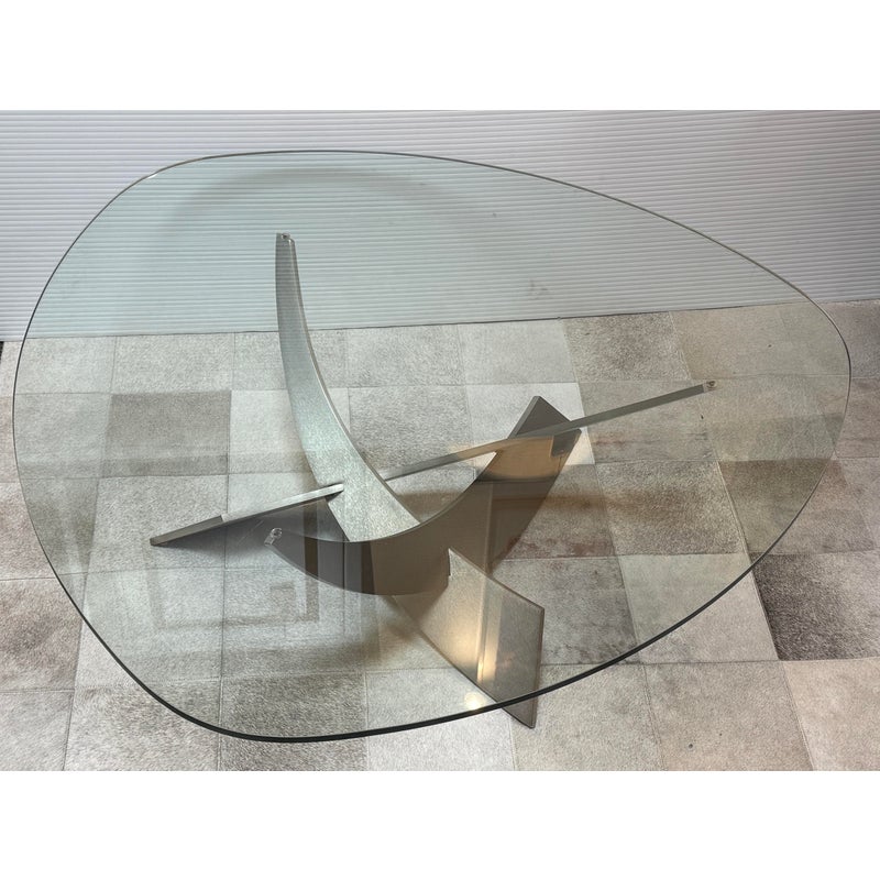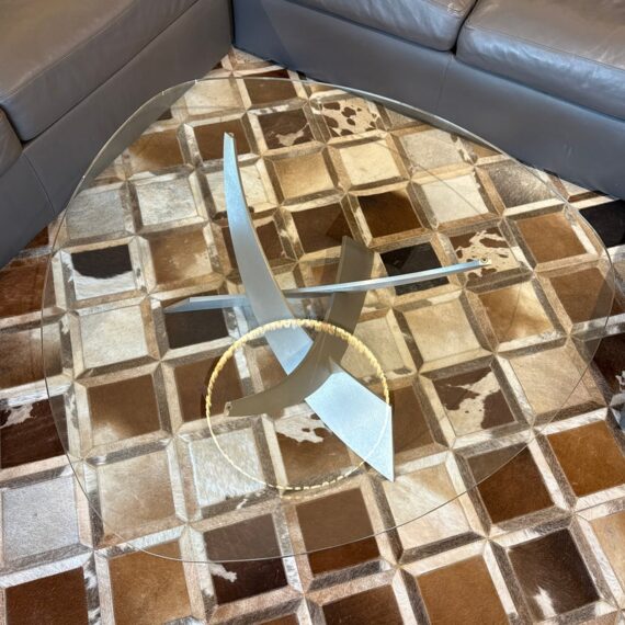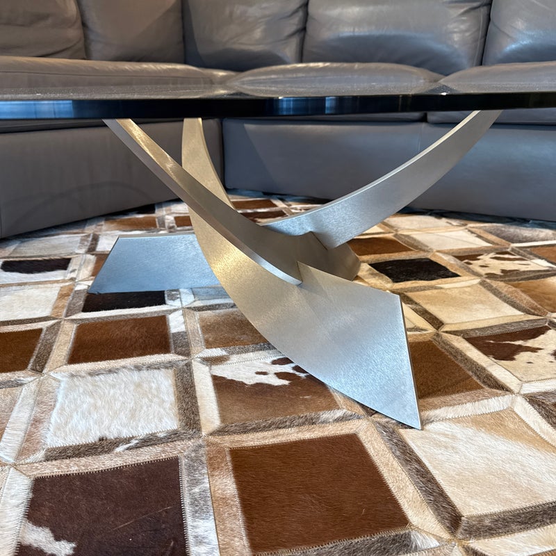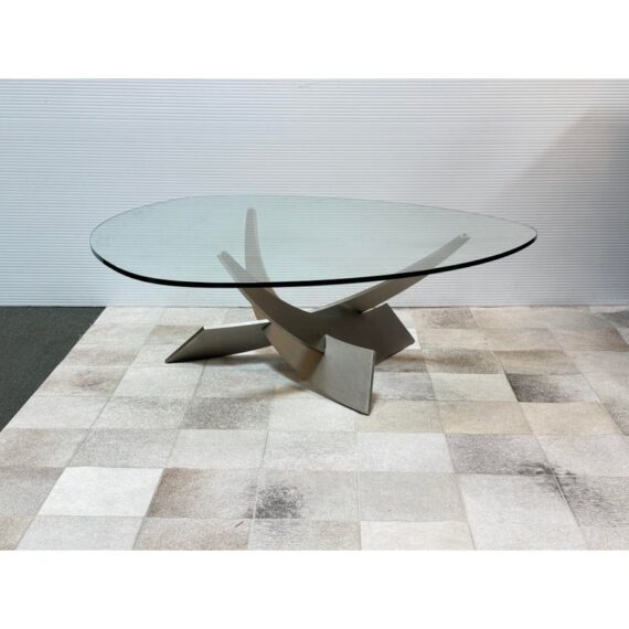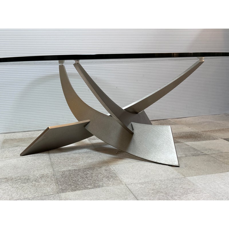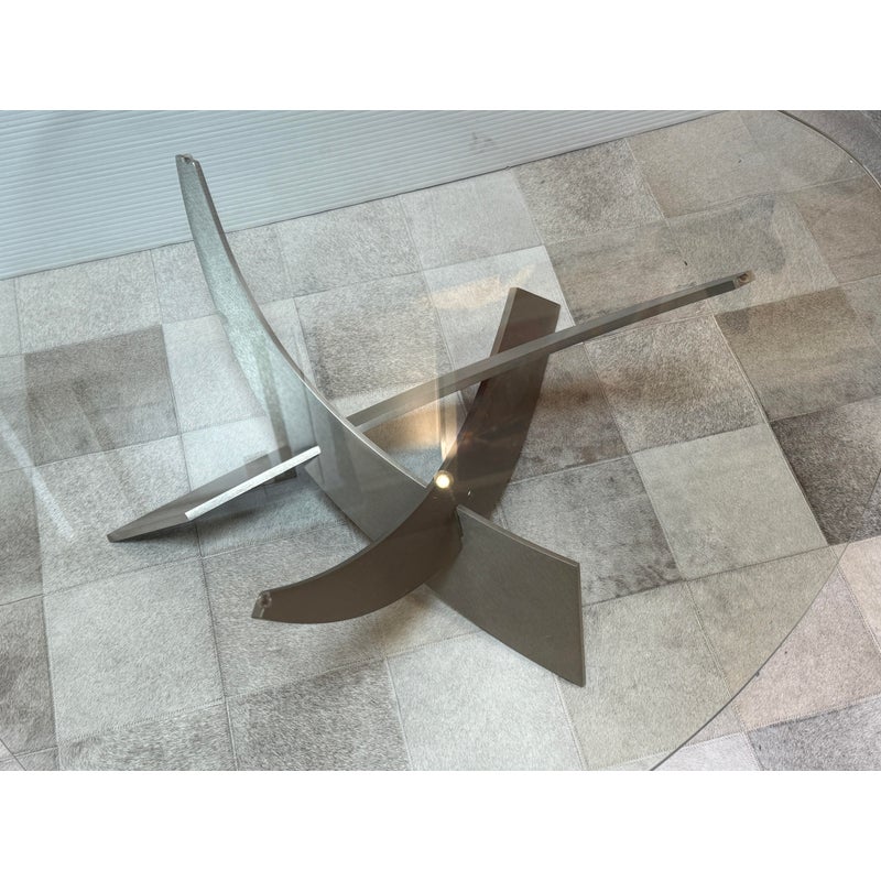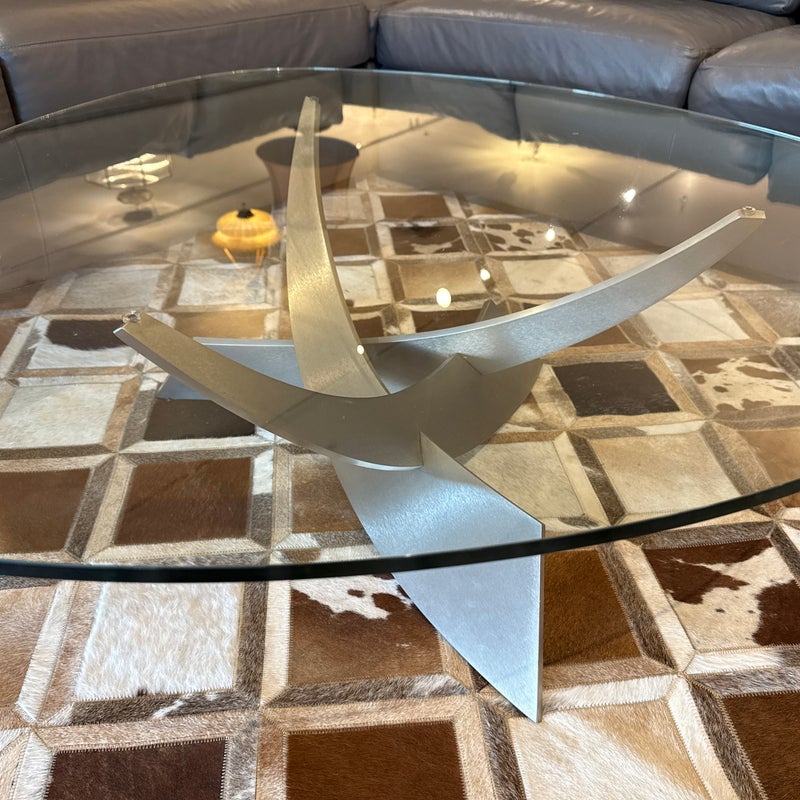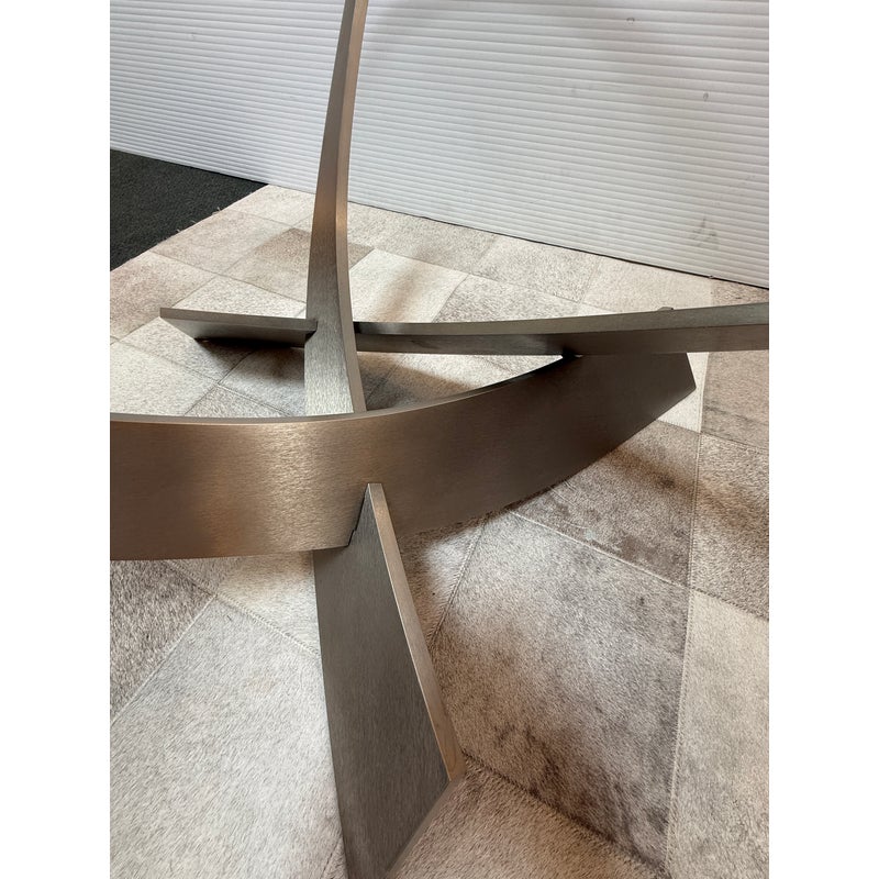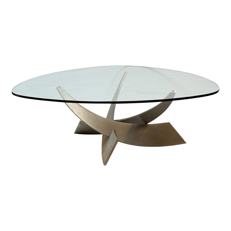 Design Plus Gallery presents the Reed Cocktail Table from Elite Studio Corp. Constructed from thick solid steel with a lustrous plated finish, this elegant design mimics a piece between sculpture rather than furniture. The table features three interlocking arms, reaching up to support the thick glass top, which are softly contoured to suggest gently worn sea stones. It is in good condition with wear that is consistent with its usage.