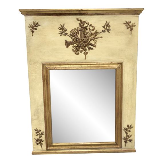 Design Plus Gallery presents a Empire Style Cream + Gold Gilt Mirror. The frieze is exaggerated to showcase an intricate carving of instruments and ribbon in gold gilt with a red paint underneath. An internal molding encapsulates the mirror in the same gold gilt application. The cream paint of the background has a crackly finish. Visible wear is a part of the old world charm, mirror is in good condition.
