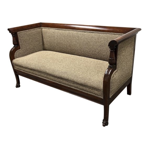 Design Plus Gallery presents an Empire Style Victorian Accent Settee newly upholstered in a Taupe fabric. Solid wood frame is stained a deep and rich mahogany and accents the turned pillars and curvature beautifully. Visible and minor wear on frame through out, chair is in good condition. Fabric is a textured Taupe polyester.