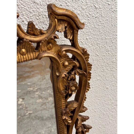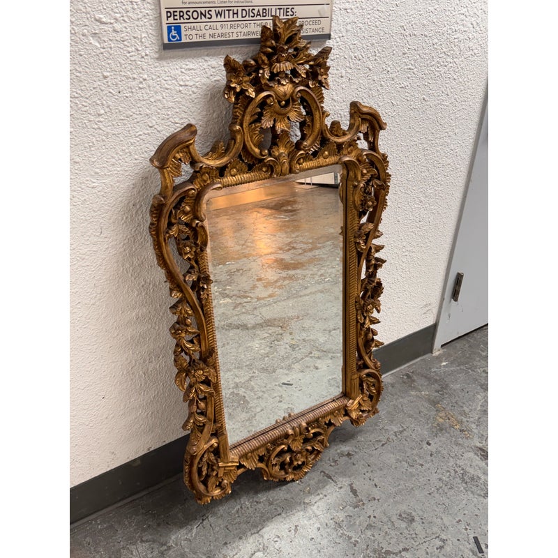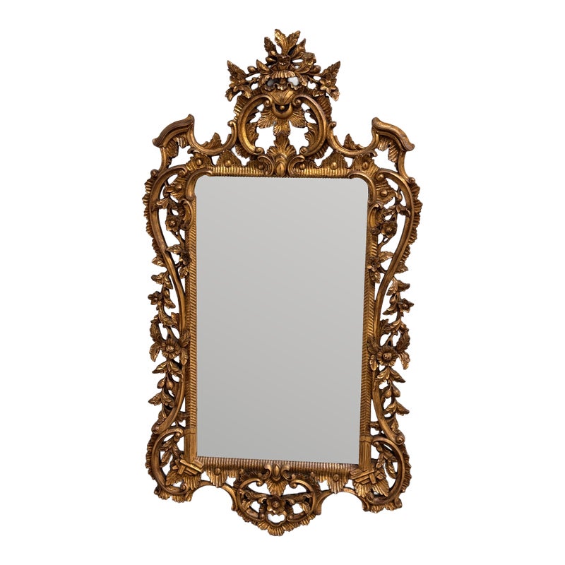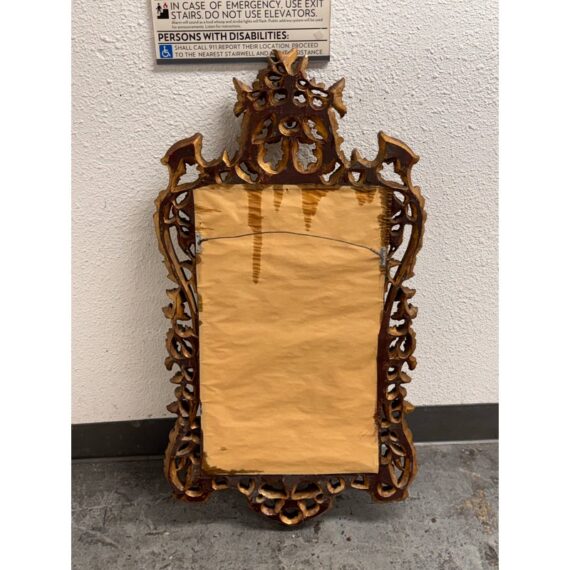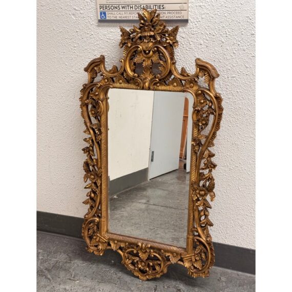 Design Plus Gallery presents an English Chippendale Carved Giltwood Mirror, Mid 20th Century. The mirror has a carved wood gilded frame. The wood is of the finest carving with an acanthus leaf cartouche and cabochon, intertwined with “C” scrolls, and acanthus leaf framing the looking glass. The tall rectangular plate is surrounded by layered molding and hand carved floral and foliate relief, with an openwork crest and a matching pierced apron that completes the composition. It is in good condition with visible and minimal wear from usage.