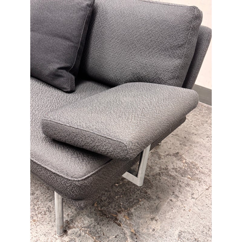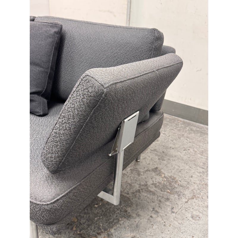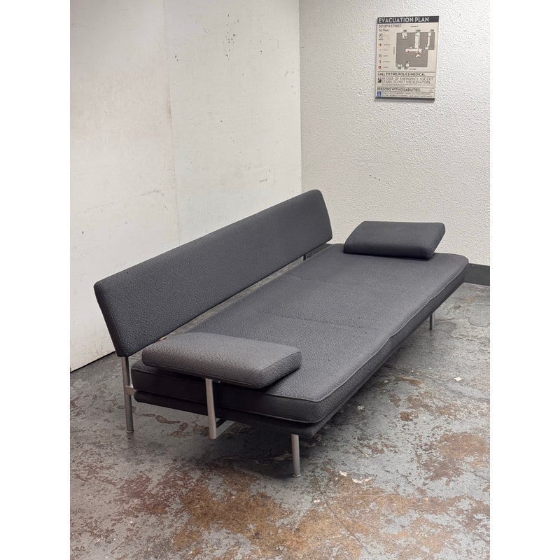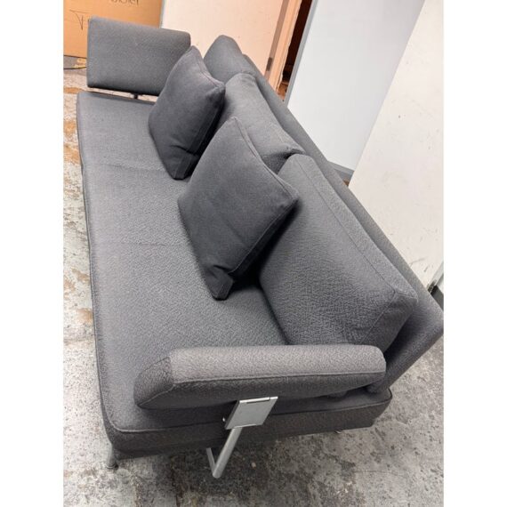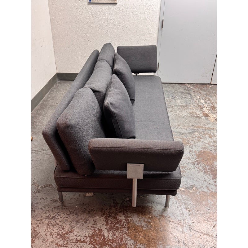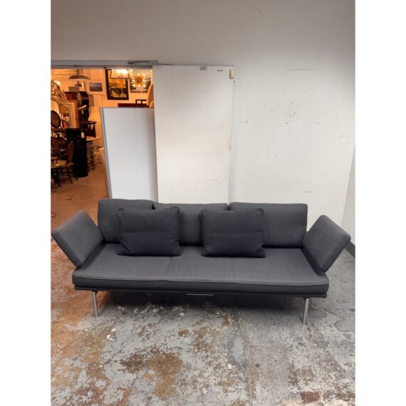 Design Plus Gallery presents a Living Platform Sofa designed by the trio EOOS for Walter Knoll. Conceived by Martin Bergmann, Gernot Bohmann, and Harald Gründl, EOOS takes its name from one of the four horses that pull the chariot of Helios in Ovid’s Metamorphoses. Their work has received more than 250 design prizes, including the Compasso d’Oro. This Living Platform Sofa expresses that philosophy through a low, linear profile with an adjustable back, pivoting side elements, and movable cushions that allow the form to shift with the structure. Upholstered in gray textile with slender metal legs, the sofa balances precision with softness in a silhouette that feels both technical and inviting. The seat can extend forward to for a sleeper. It is in good condition with minimal fading from sun exposure and minimal markings on fabric from usage. Made in Herrenberg, Germany.