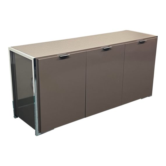 Design Plus Gallery presents a Lacquer Credenza by EQ3. A lovely glossy mink shade of brown envelops the modern credenza, finished in polished chrome details. Three oors open to reveal a contrasting chartreuse interior with removable/adjustable shelves for efficient storage. Light fading on top surface; otherwise condition is consistent with age and use.