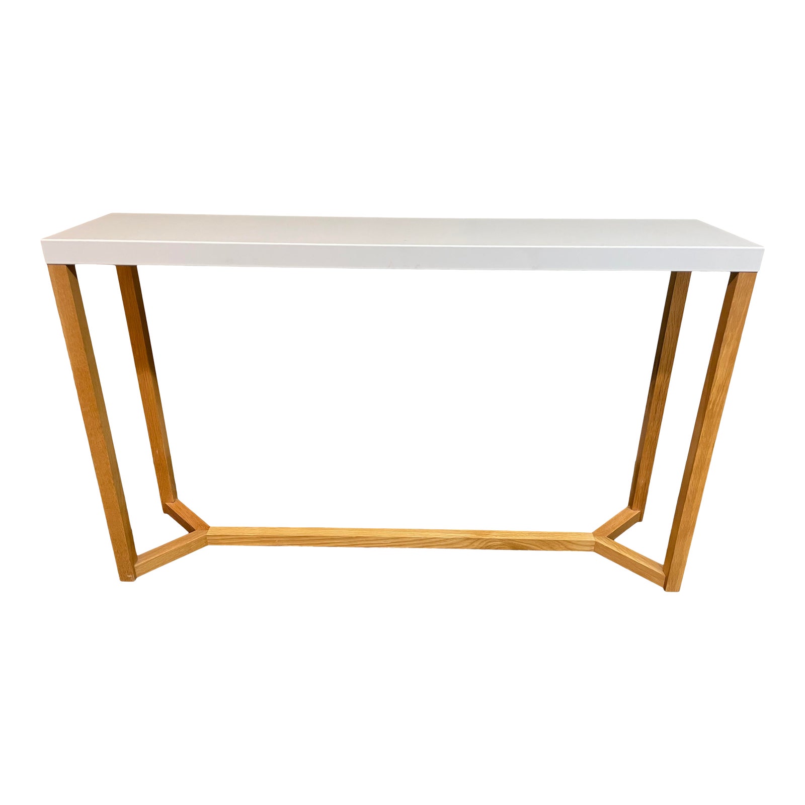 Design Plus Gallery presents the EQ3 Trivia Console Table. The wood used is Oak. The four legs extend at the bottom and connect to a wood beam for stability. The white powder-coated metal on top is bent on the long edges, with its ends resting in a groove. Wear is consistent with use; item is in good condition. The geometric angles and perpendicular connections make this console a simple yet elegant option.