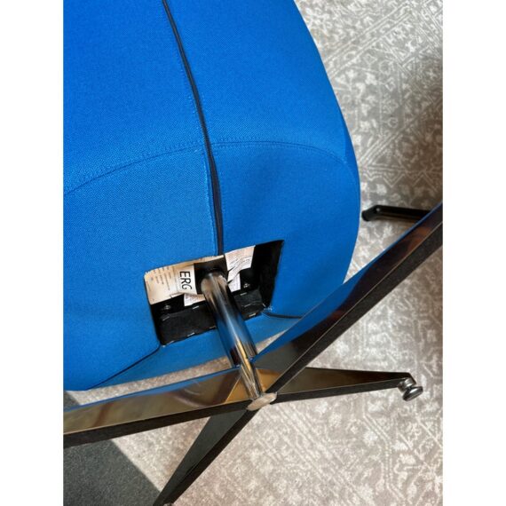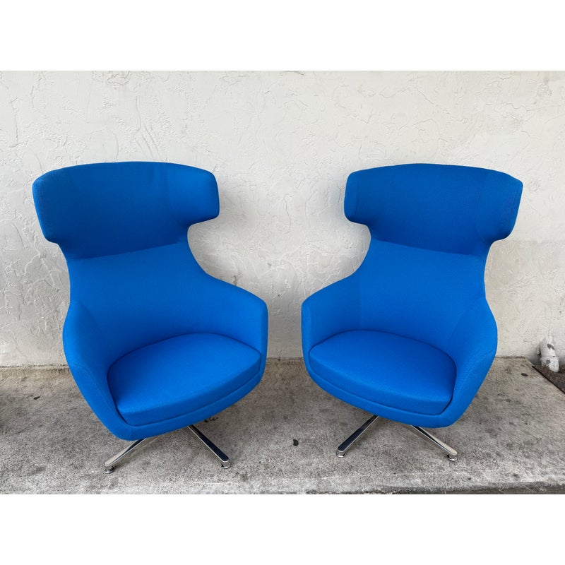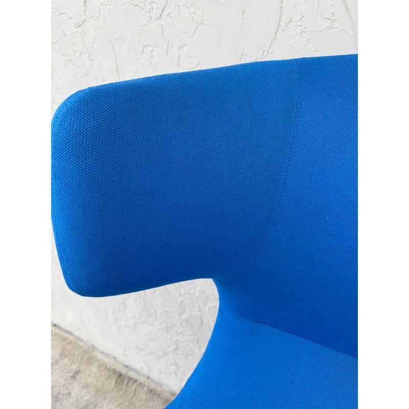 Design Plus Gallery presents a Maxwell Chair from ERG International. The chair has a grand statement with its prominent wing back design. Its curve at the top for an attractive barrier to distraction while sitting in comfort. It has a generous cushioned seat with contoured details that offer comfort in the seat and back. Its bold cobalt blue tone matches its dynamic shape perfectly. It is in good condition with wear that is consistent with usage. Made in the USA.