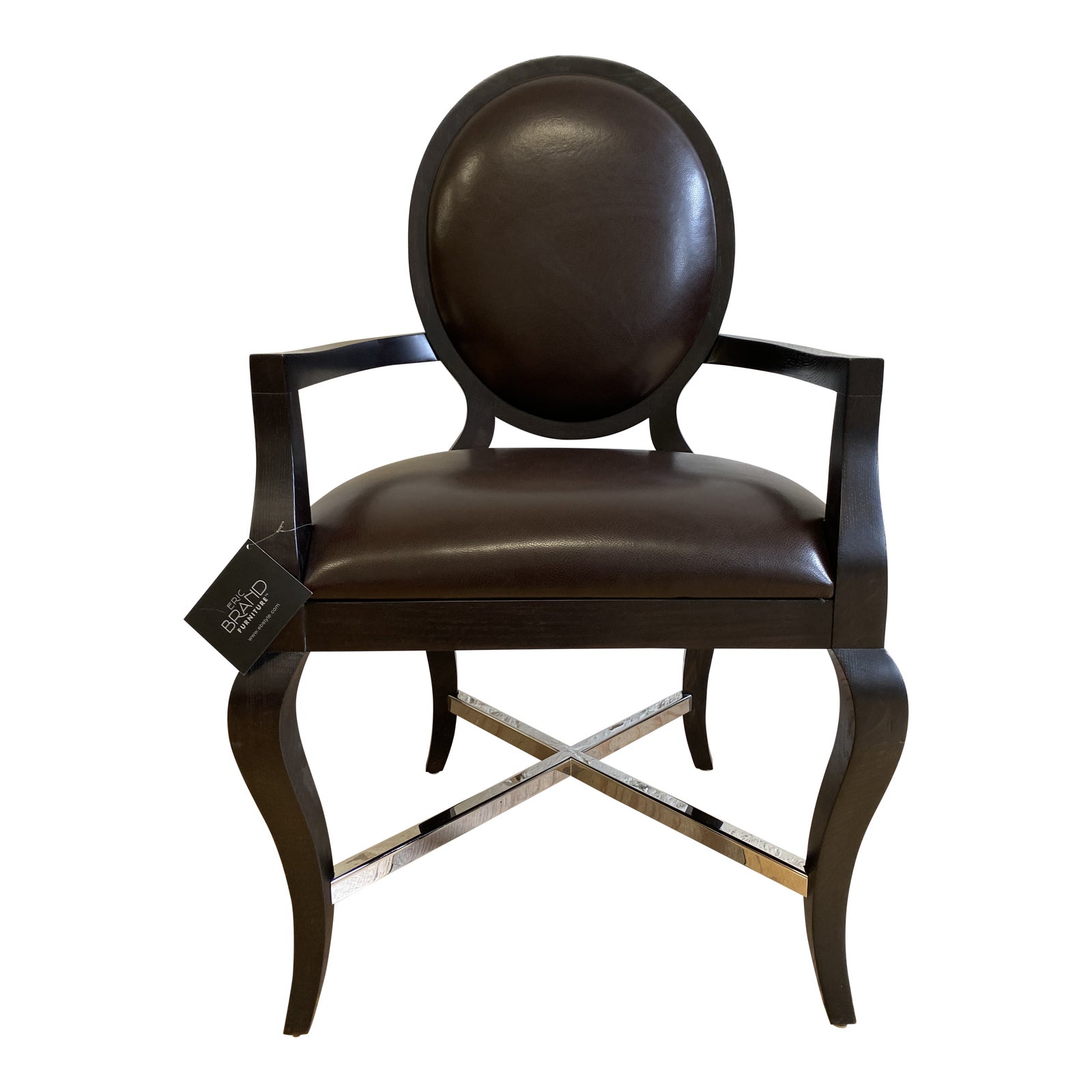 Design Plus Gallery presents a Eric Brand Furniture Contemporary Paris Bergere Arm Chair. Polished chrome details are beautifully contrasted against the espresso wood stain and Chestnut leather. Minor wear on surfaces.