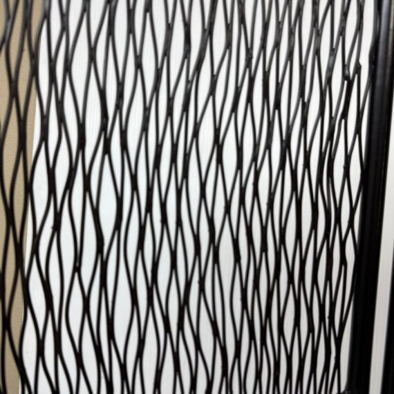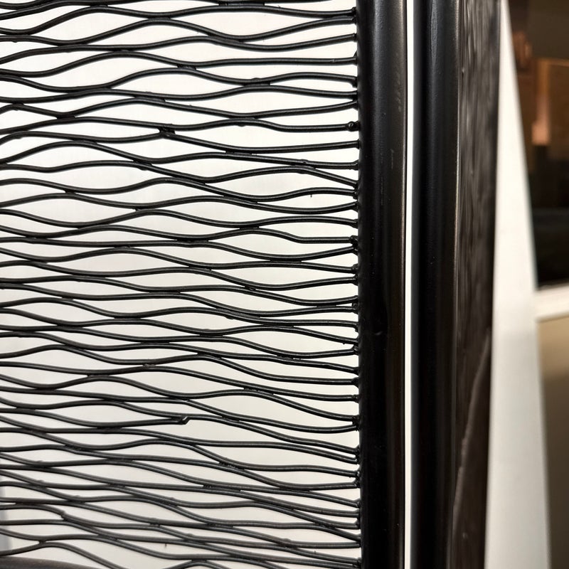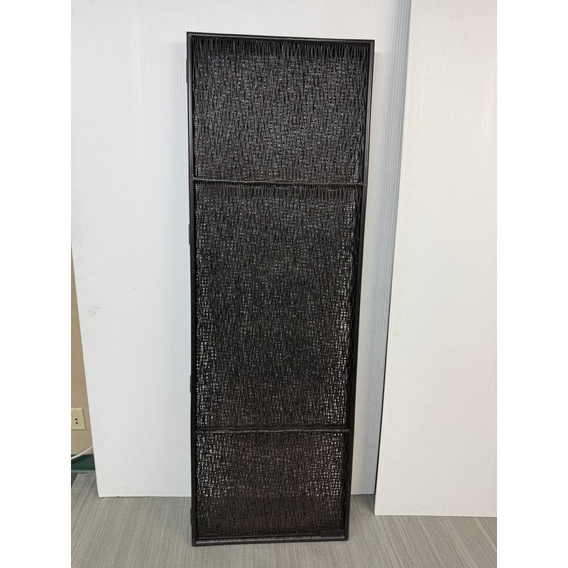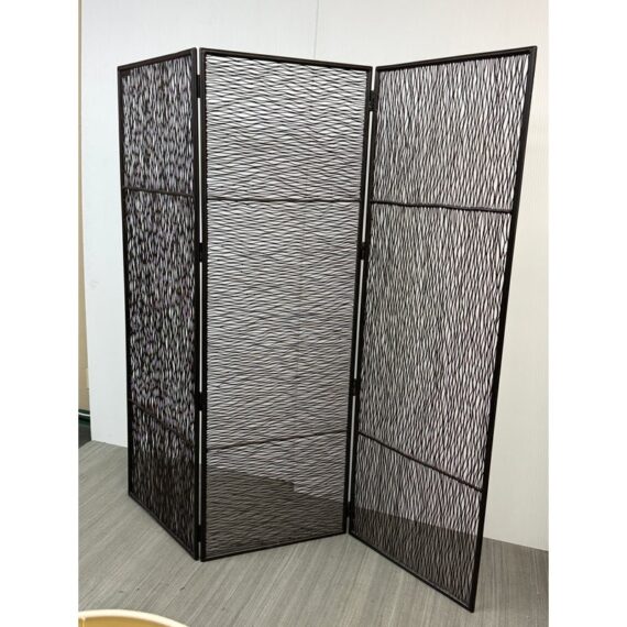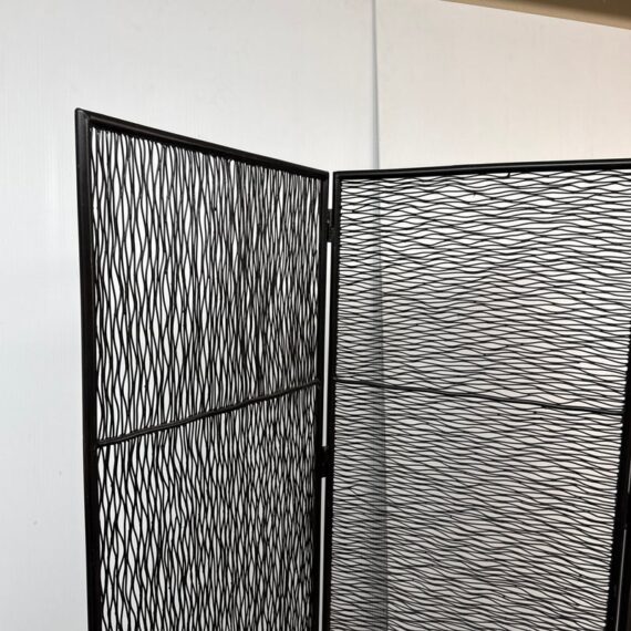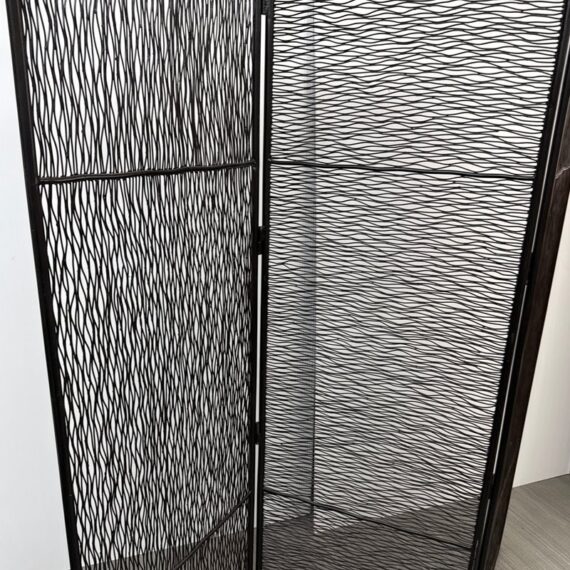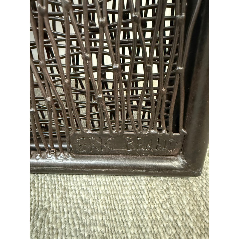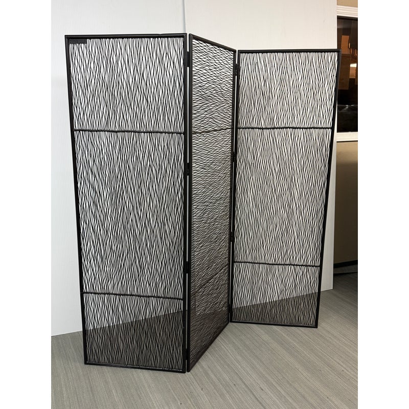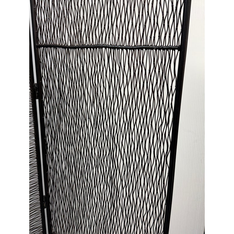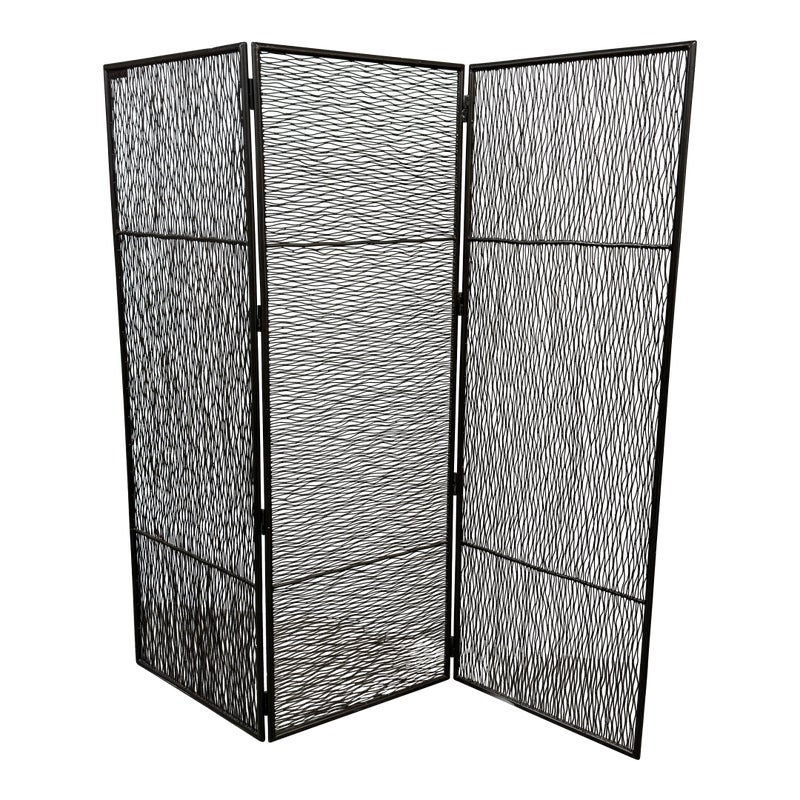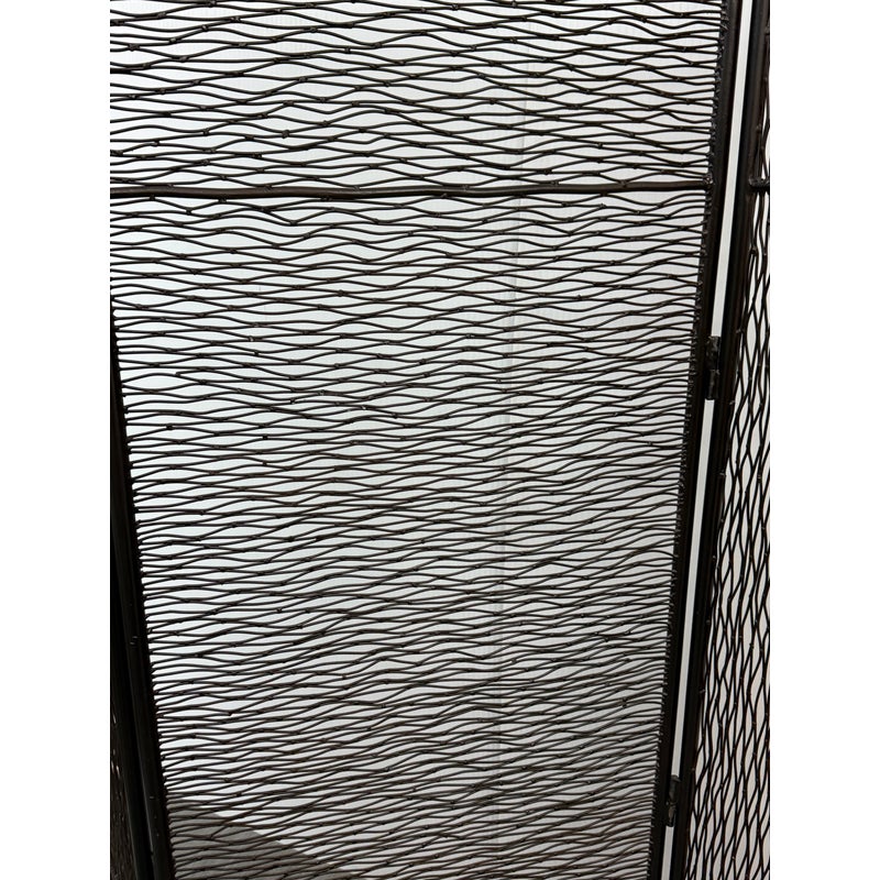 Design Plus Gallery presents the Wisteria Screen by Eric Brand. The screen encapsulates three black frame panels that are two feet wide apiece with an organic pattern of metal “vines”. The bronze powder-coat metal in a delicate weave. pattern will create a magical backdrop or partition in your space. Showroom sample, condition is good.