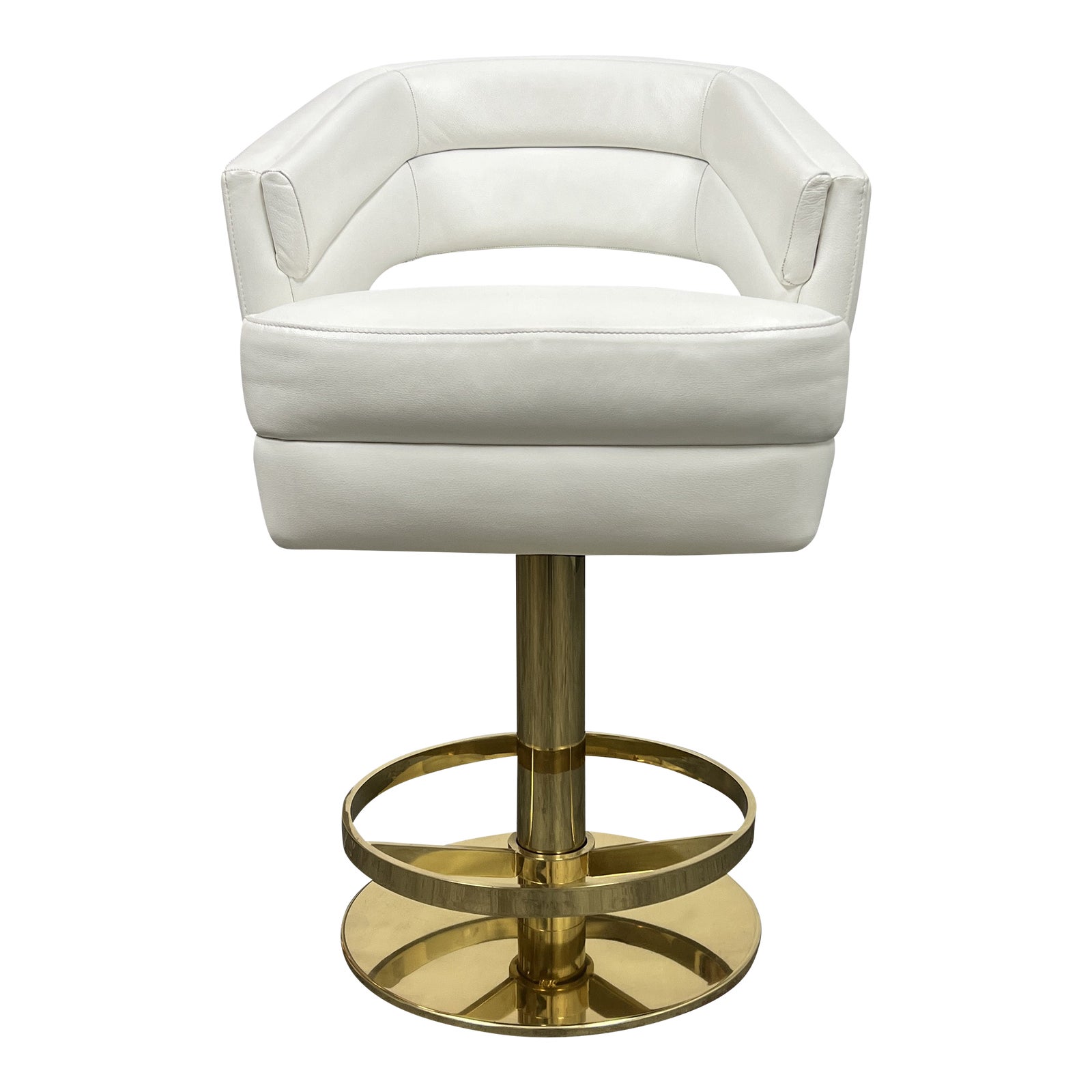 Design Plus Gallery presents a Russel Counter Stool by Essential Homes. A modern nod to an inspiration of Hollywood Regency and Art Deco. Upholstered in a white leather with a golden polished brass base. The base can spin 360 degrees, providing stress‐free movement to delve into the space around. Made in Portugal.