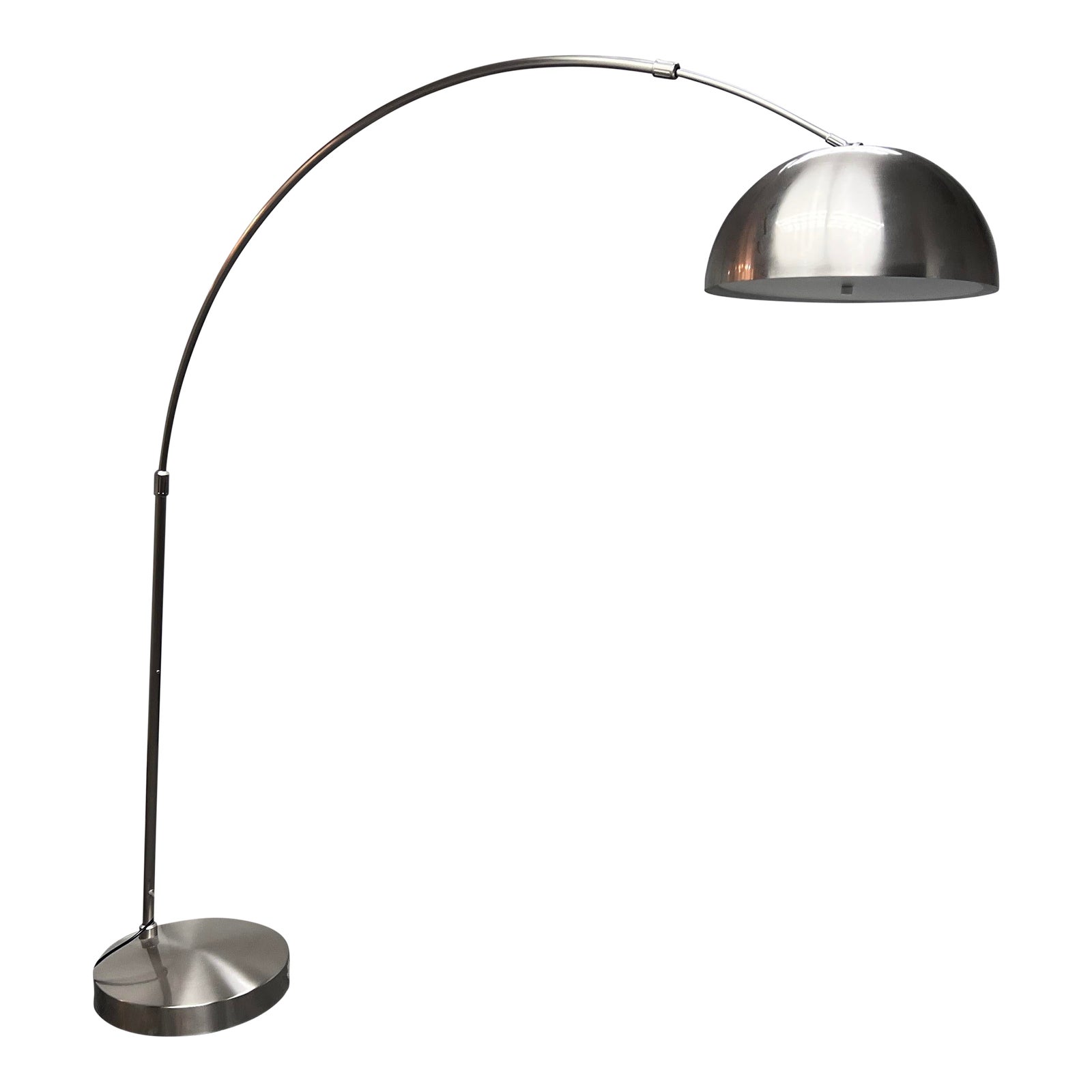 Design Plus Gallery presents a Swing Arm Floor Lamp in Stainless Steel by Estiluz. Ultra luxe and modern swing arm that has a stern solid base and a swooping arc to center light over furnishings as an alternative to having a chandelier or overhead light source. In good condition with some surface wear that is consistent with its age + use.