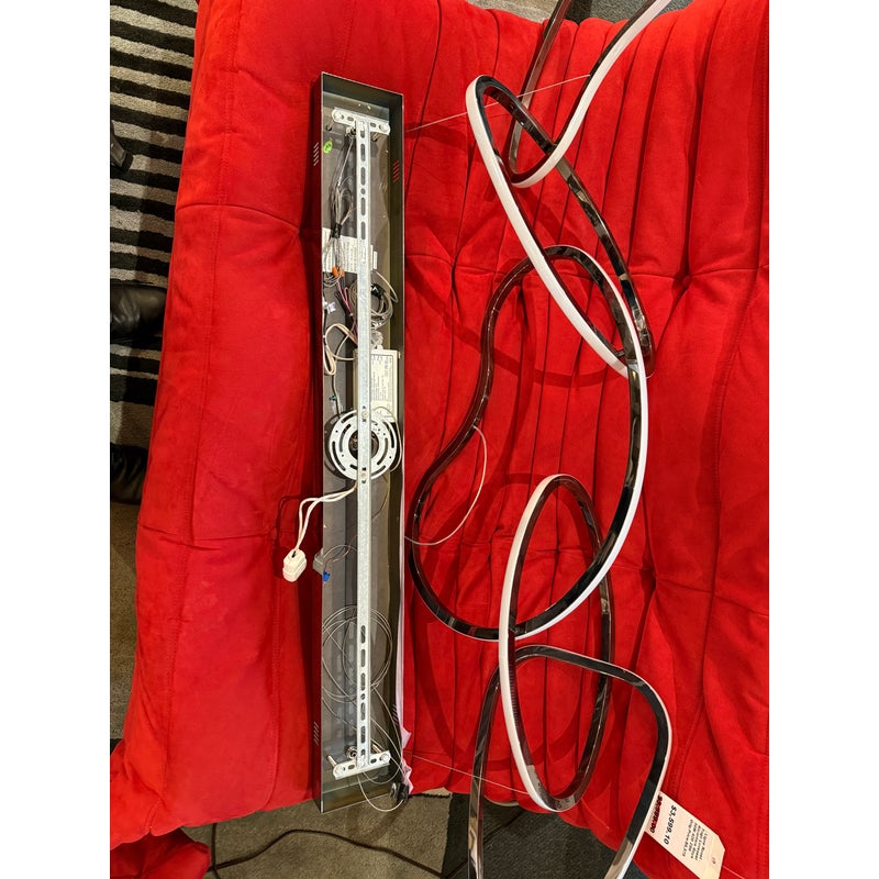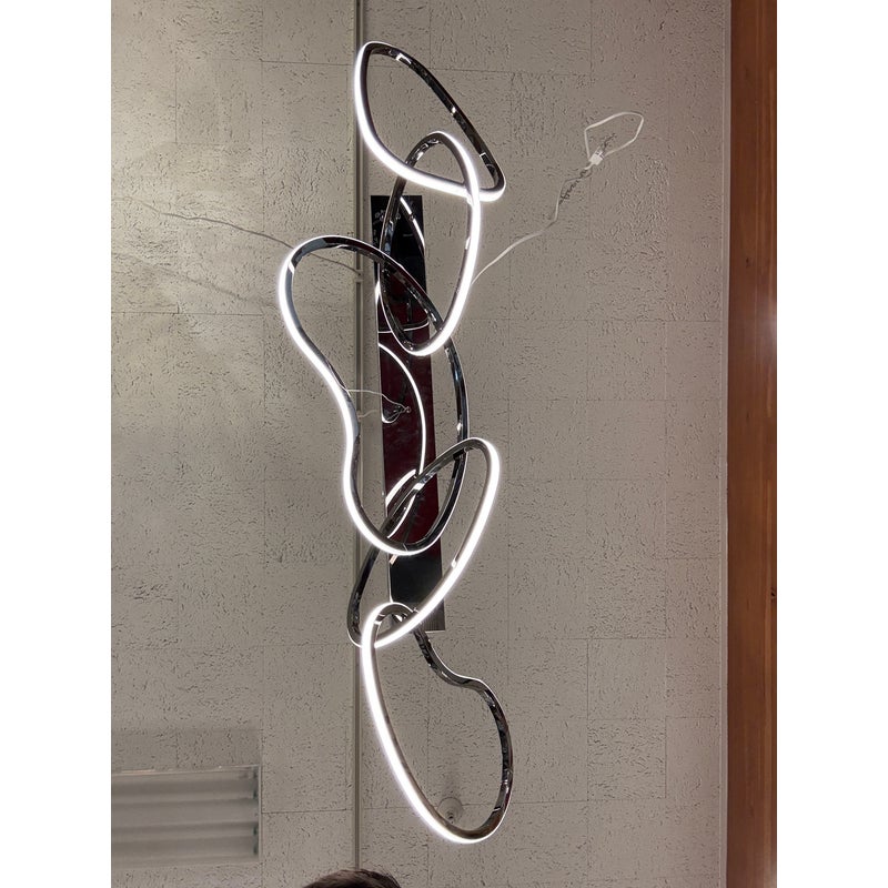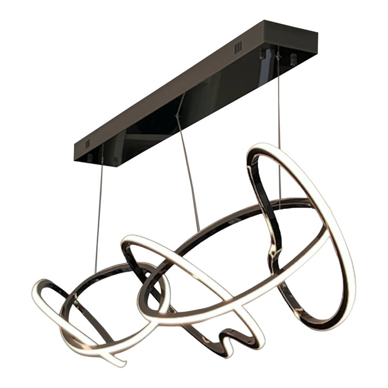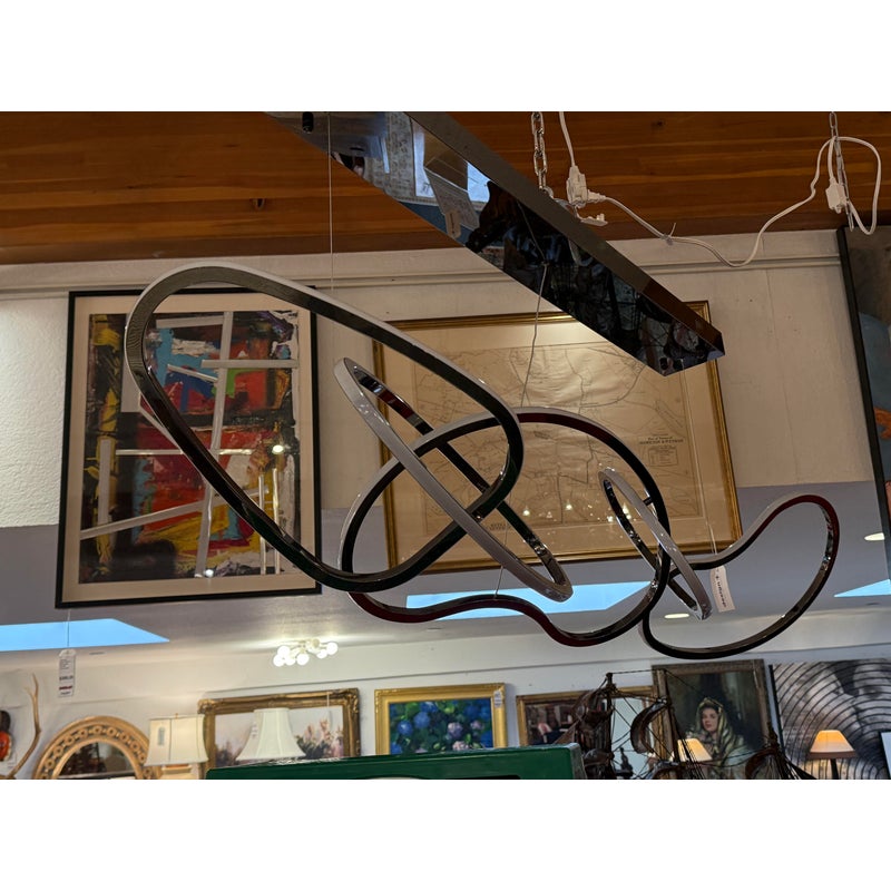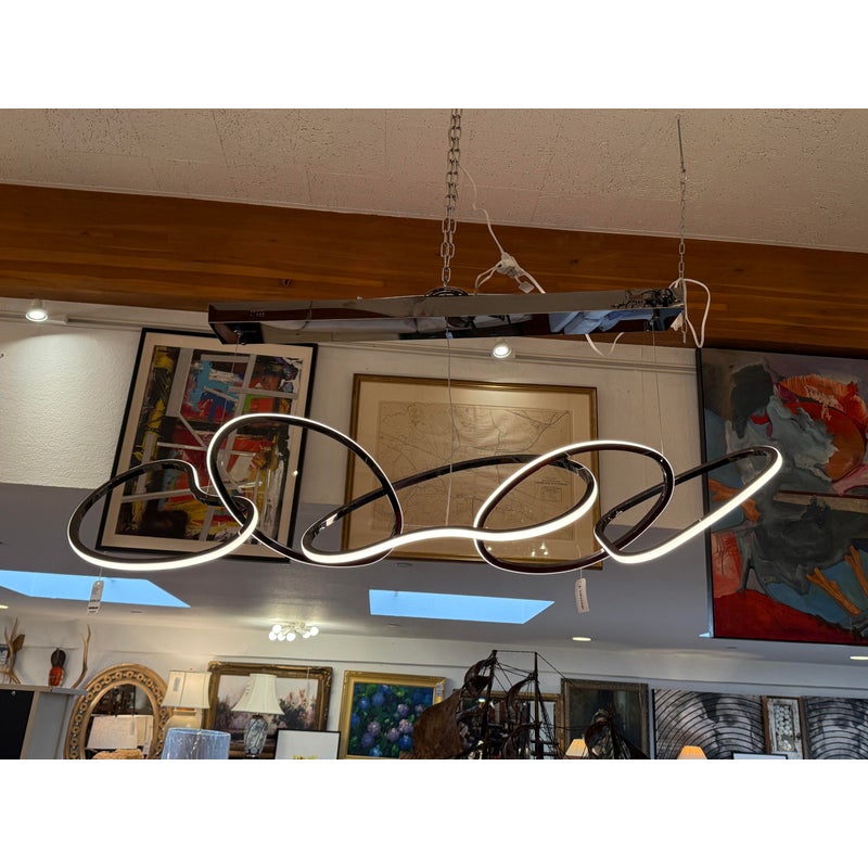 Design Plus Gallery presents the Brushed Chrome Unity Chandelier from ETA Lighting. This linear pendant is a contemporary LED fixture known for its sculptural design featuring interconnected rings or organic loops. It is commonly used as a centerpiece for kitchen islands and dining rooms. The fixture is in good overall condition for its usage.