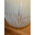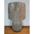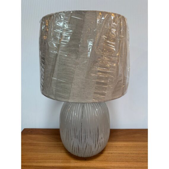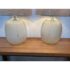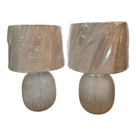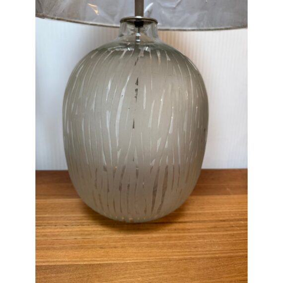 Design Plus Gallery presents a Pair of Etched Glass Table Lamps. The lamps have a frosted glass body with etched treatment that gives off translucent string all around their oval body. Each has a burlap shade that looks new as it is still wrapped up. They are both in good condition with minimal wear.