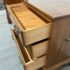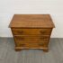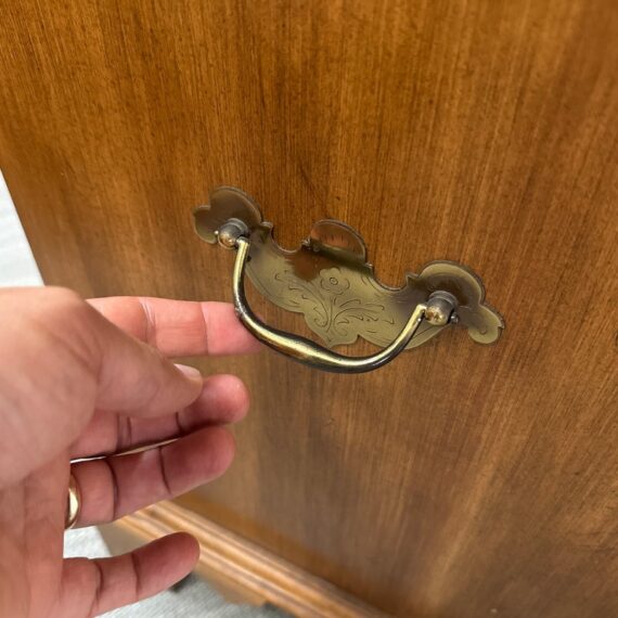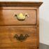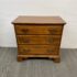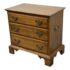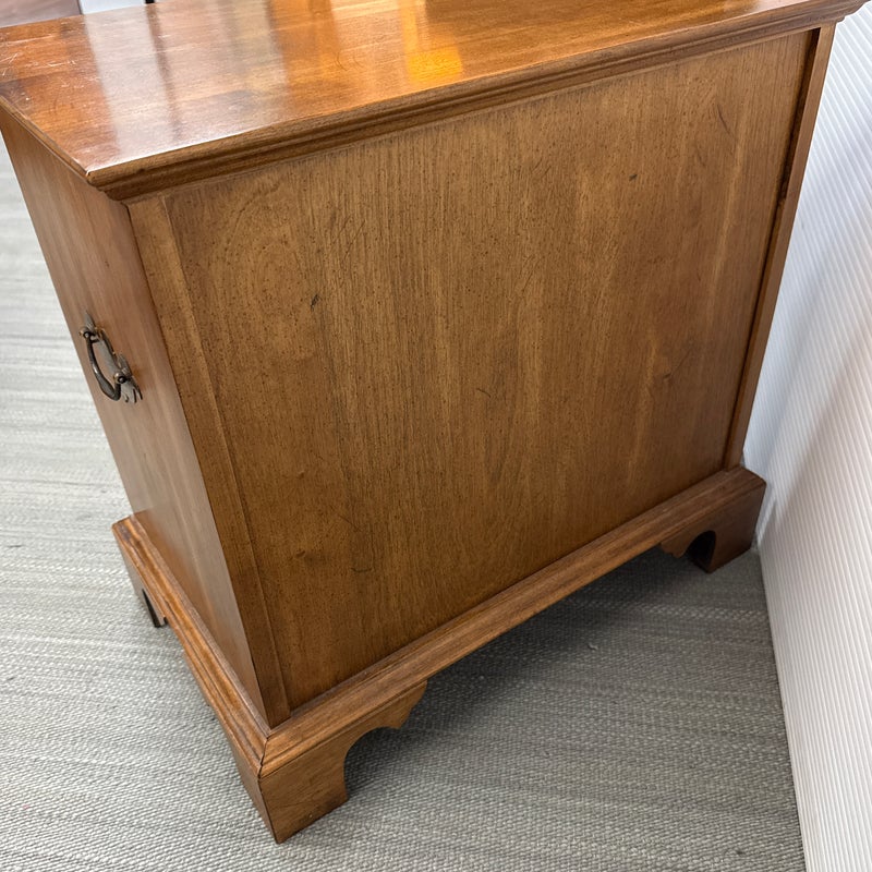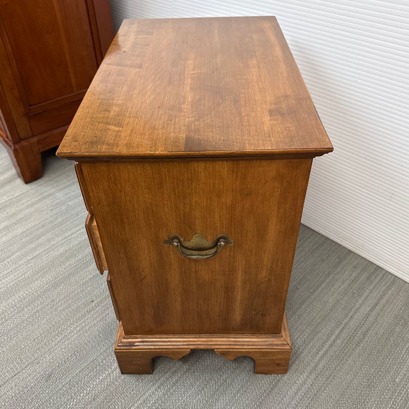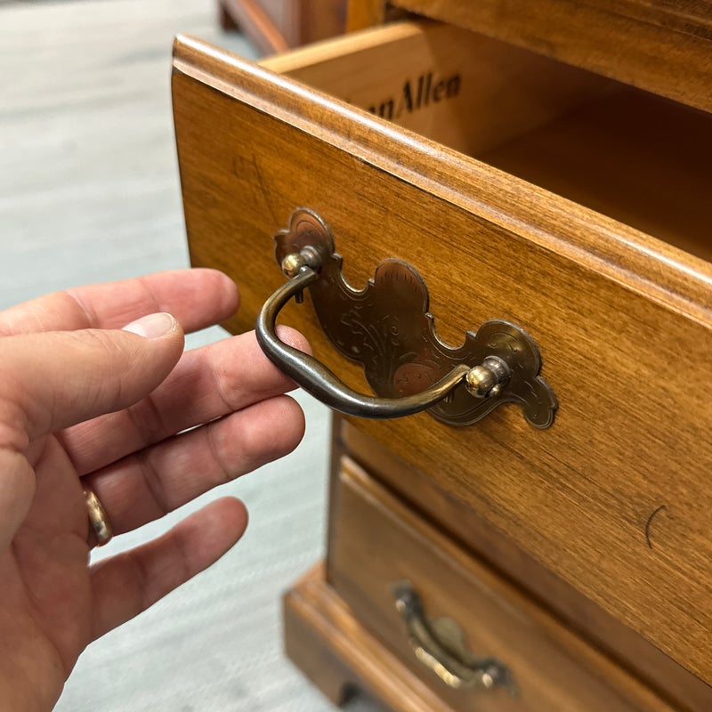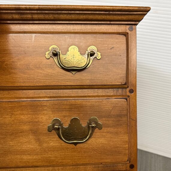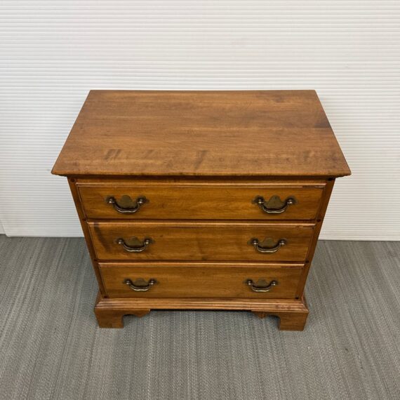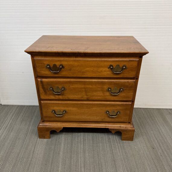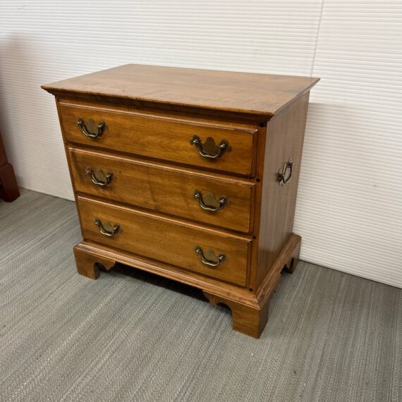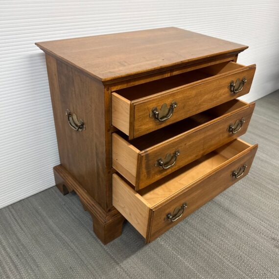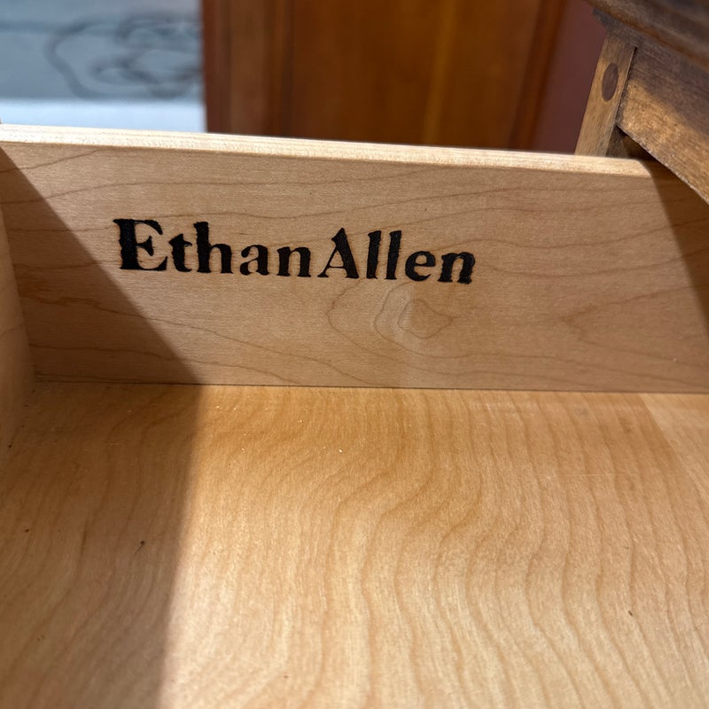 Design Plus Gallery presents an Early American 1776 Collection Three-Drawer Bedside Cabinet by Ethan Allen. The cabinet is constructed with solid maple and birch wood with dovetailed drawer. Storage features full width drawers embellished with hardware of aged brass, sized for those busy handicrafts. Minor wear from use; nightstand is in good condition. Made in USA.