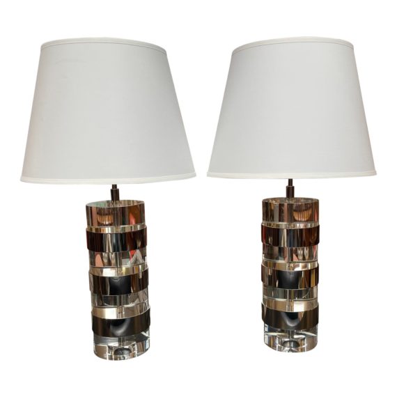 Design Plus Gallery presents a Pair of Ethan Allen Asher Table Lamps. The makers created this sophisticated lamp for Ethan Allen originally made brass urns and decorative pieces in Hong Kong. the mix of acrylic and polished nickel is effortless with this elevated Deco inspired Hollywood Regency look. Pair of topped of with ivory linen shades. Little evidence of wear, good condition. Made in Hong Kong.
