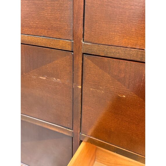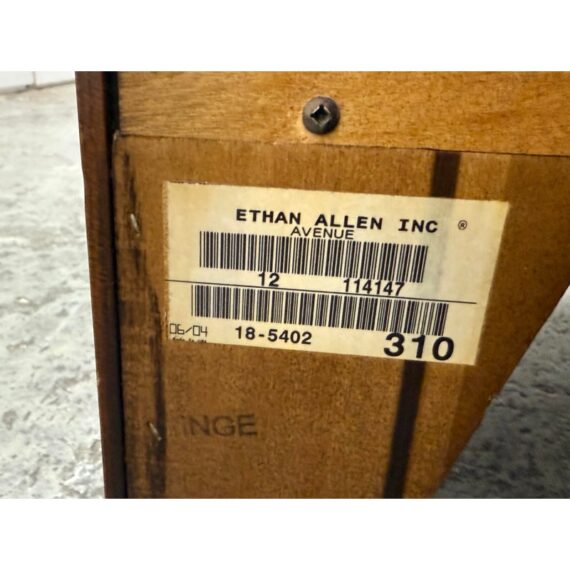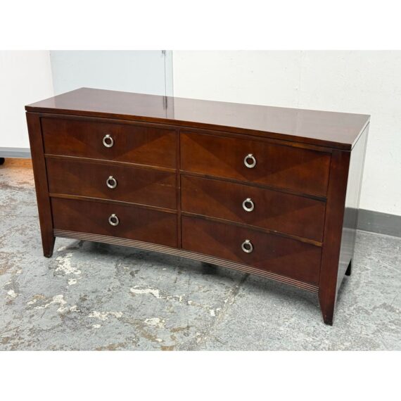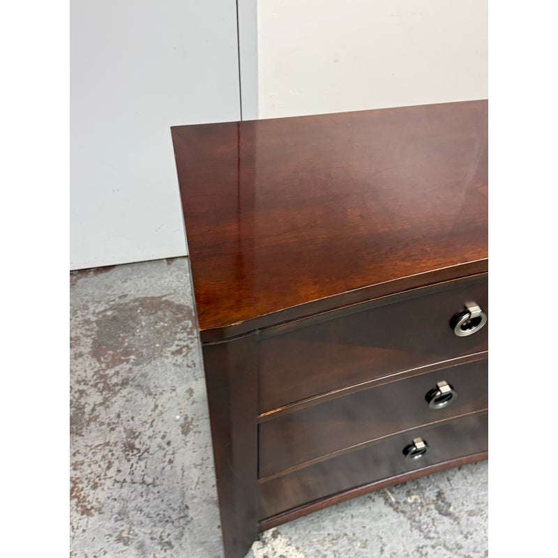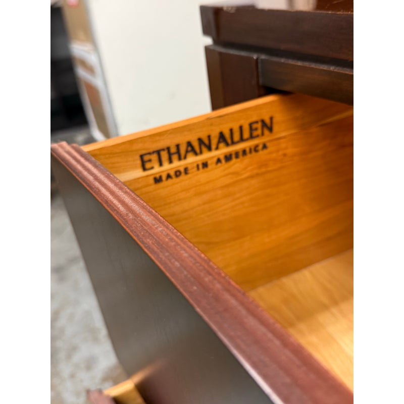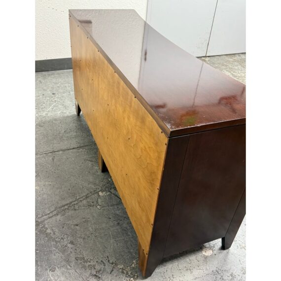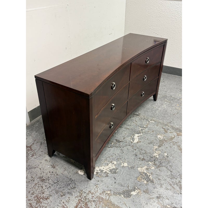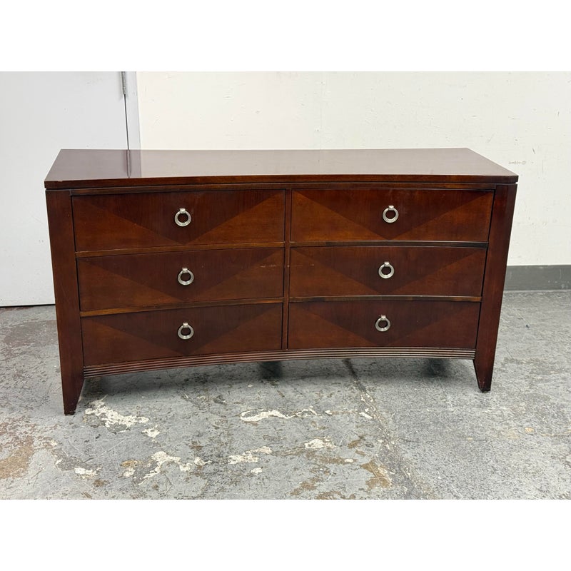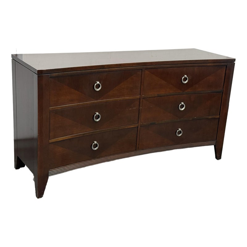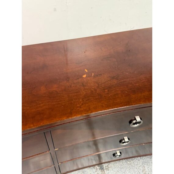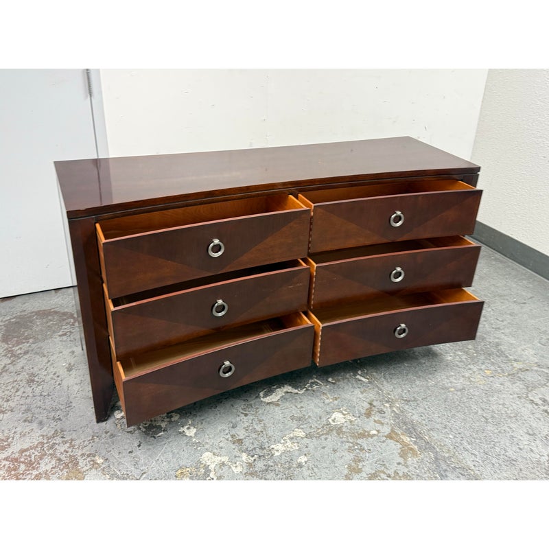 Design Plus Gallery presents a Bow Front Early 21st Century Dresser from Ethan Allen. The wood dresser has a medium cherry wood finish with shiny lacquer finish and ring pull antique nickel drawer pulls. Each row has three drawers of staggered size. Is in fair/good condition overall with visible wear for its usage. Areas of finish had been removed. Made in USA.