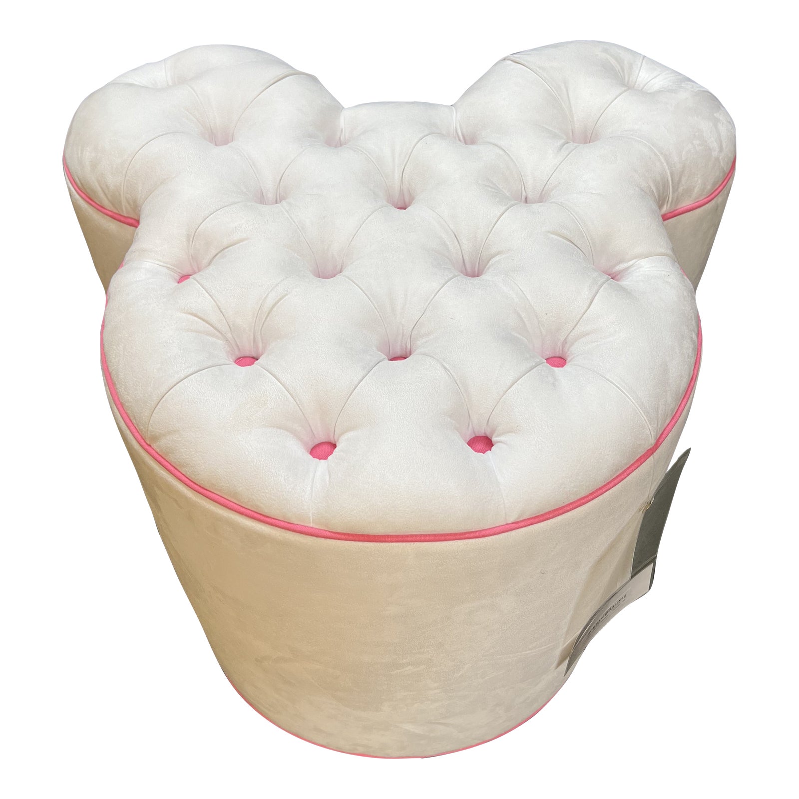 Design Plus Gallery presents a Mickey Mouse Ottoman by Ethan Allen. Upholstered in an off white fabric fabric, piping and tufted with pink buttons. The piece can be used as a coffee table or extra seating.