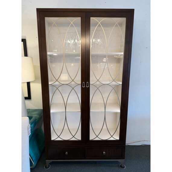 Design Plus Gallery presents a Dorset Display Cabinets from Ethan Allen. This exquisite display cabinet is meticulously crafted from mahogany and walnut veneers, exuding a timeless elegance. The cabinet’s exterior is adorned with tempered glass doors, intricately embellished with bold laser-cut metal interlocking oval motifs that create a captivating visual effect. Within the contrasting interior, adjustable shelves are thoughtfully designed with plate grooves, providing ample space for displaying your cherished items. The cabinet’s built-in lighting system illuminates the contents, enhancing their visual appeal. Beneath the display area, a pair of soft-close drawers offers secure storage options, ensuring that your valuables remain protected.
