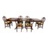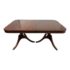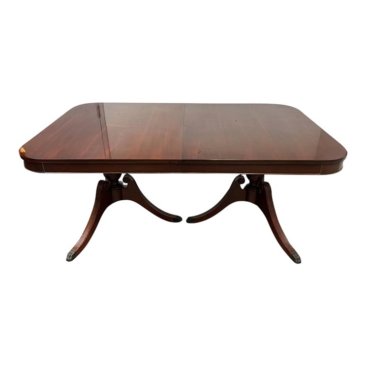 Design Plus Gallery presents a Late 20th Century Ethan Allen Double Pedestal Mahogany Dining Table. Pedestal bases are lifted with brass capped feet and turned urns. The rounded rectangular surface has a substantial apron and showcases the lovely and welcoming tone of the mahogany. Comes with two optional leafs for larger gatherings. Does not come with Chairs. Minor wear through out, dining table is in good condition.