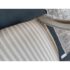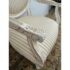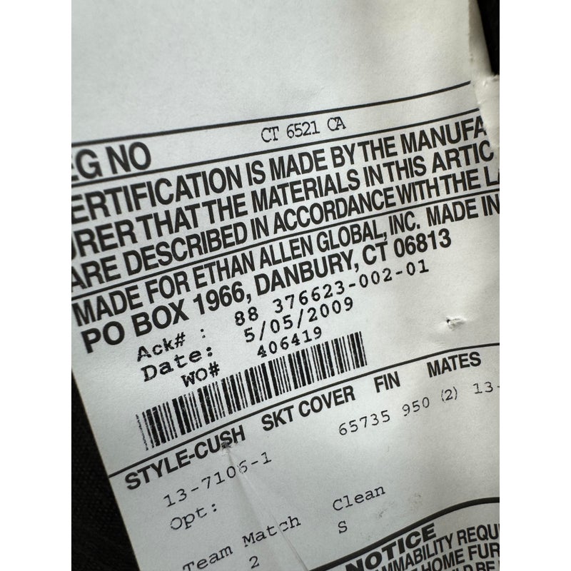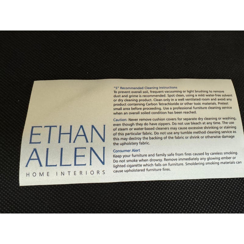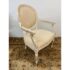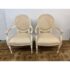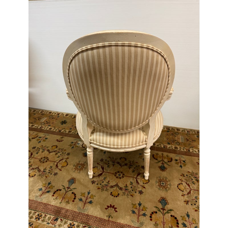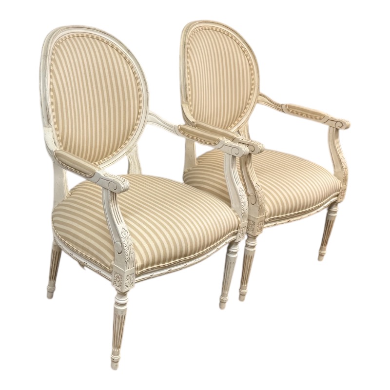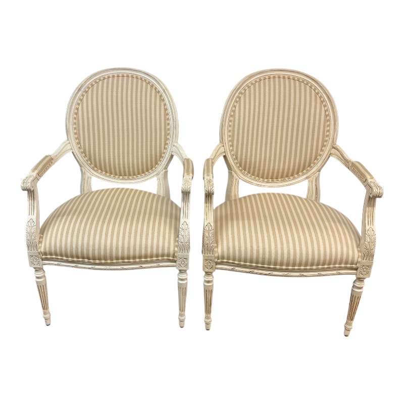 Design Plus Gallery presents a Pair of French Louis XVI Style Armchairs from Ethan Allen. Each armchair has an oval upholstered back, a padded seat, and upholstered armrests in a beige and cream stripe textile. The painted wood frames show carved floral and foliate motifs, scrolling arms, and fluted legs that reference classic Louis XVI styling. This is a discontinued model with the brand and they are in good condition with visible and minimal wear from usage.