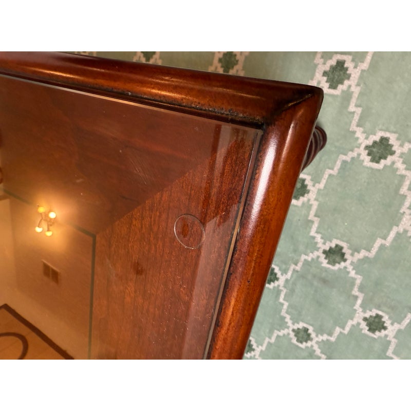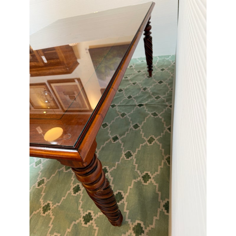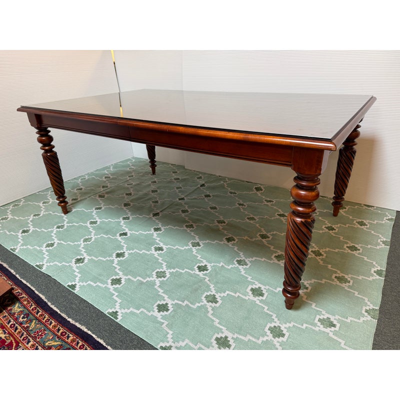 Crafted from stained maple with natural characteristics including wormholes and mineral colorations. Extends to seat the whole crowd, with two leaves. Custom glass protects the table when not extended. Light surface wear on corners from rubber protectors (under glass).