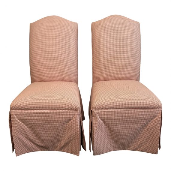 Design Plus Gallery presents a Pair of Ethan Allen Mitchell High-Back Chairs. Camel back skirted chairs add color and subtle patterning with rose colored gingham patterning. Espresso finished wood legs, minor wear on fabric.