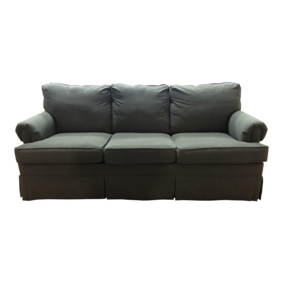 Design Plus Gallery presents a rolled arm sofa by Ethan Allen. A classic design with a skirted base. Consist of three seat and back loose cushions. Upholstered in a off Gray Greenish Fabric. Arm Height: 25 inches, Seat Height: 19 inches.