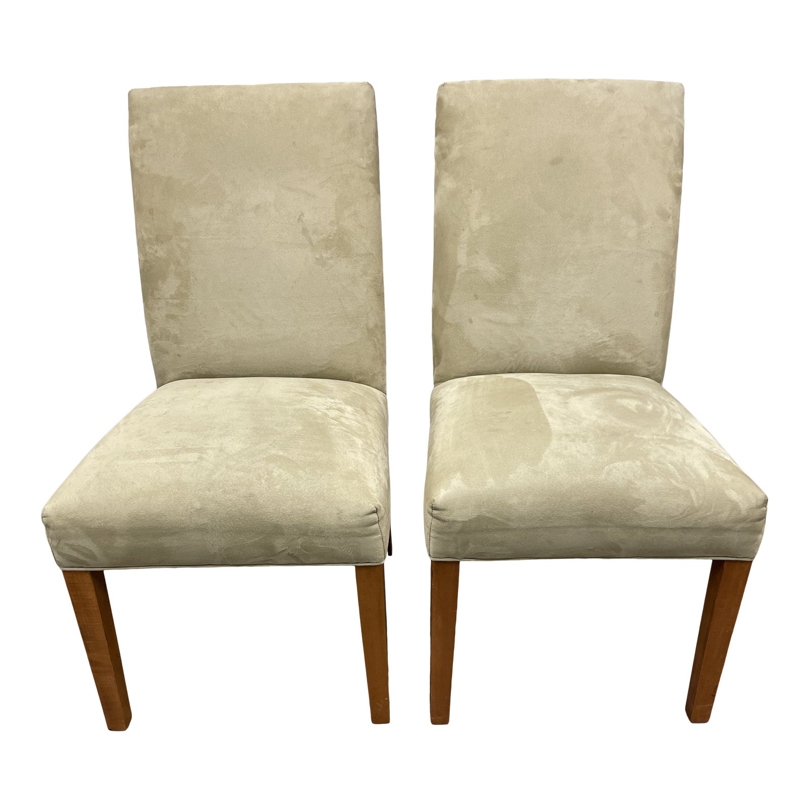 Design Plus Gallery presents a Pair of Ethan Allen Savannah Dining Chairs. The collection name takes inspiration from the Parsons School of Design. The original Parson’s style chair was created in the early 20th-Century. The simple and timeless lines of the original silhouette have continued into this contemporary take. Tapered chestnut legs support the micro suede tan seat and back. Frame constructed from kiln-dried hardwood for long-lasting quality. Visible wear through out, good condition.