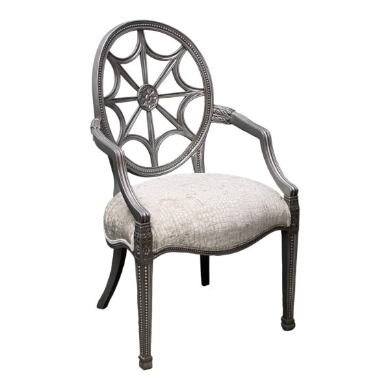 Design Plus Gallery presents a Silver Framed Spiderback Arm Chair from Ethan Allen. The gilt silver finish is finely molded with plenty of eye catching details around the frame. The fabric is a luminous silver velvet with an embossed croc print. The chair is in good condition with minimal wear for its age + use. Made in the USA.