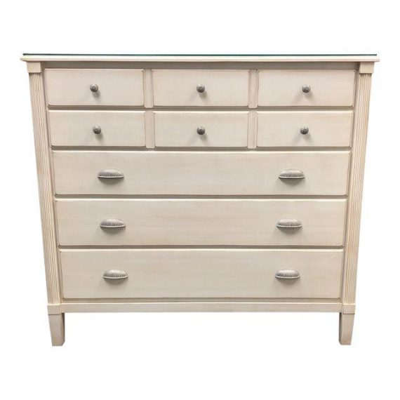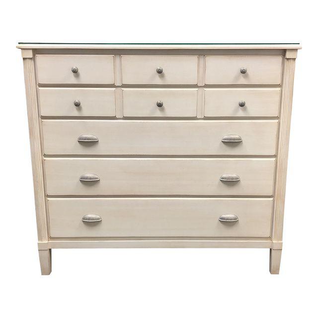 Design Plus Gallery presents a five drawer chest. The chest is part of Ethan Allen’s Swedish Home Collection. The chest has an Off-White Antique wash finish. The two top drawers appear to be be three drawers but are all one with interior divisions to help with organization. The piece also comes with a protective glass top.