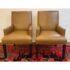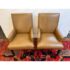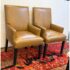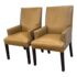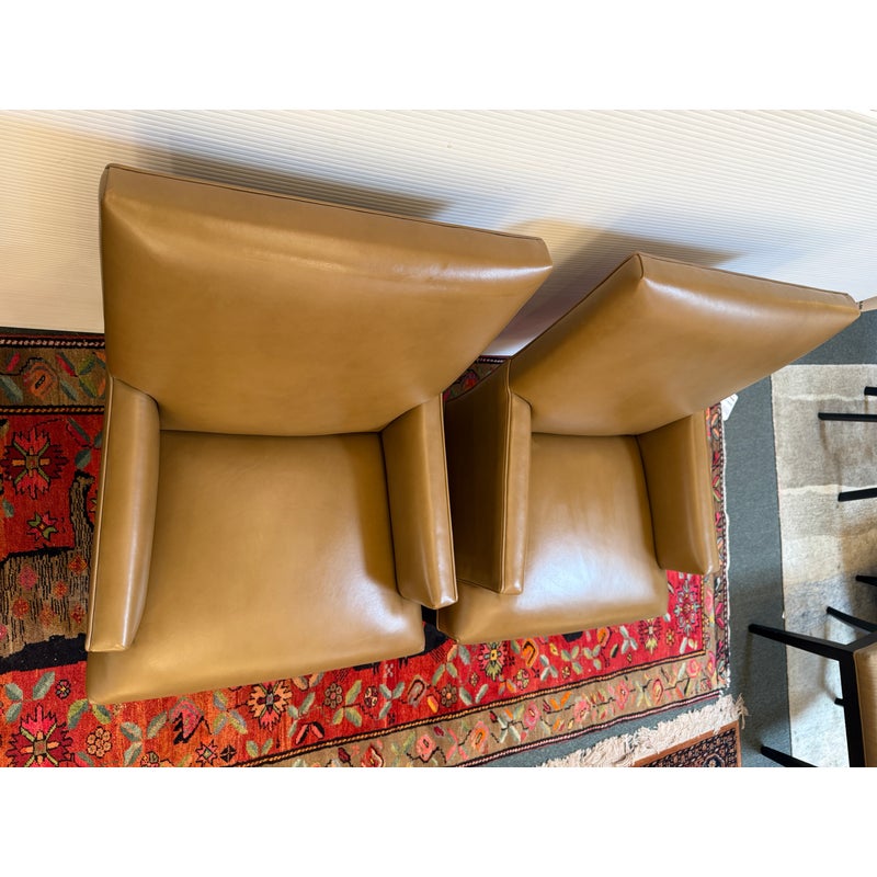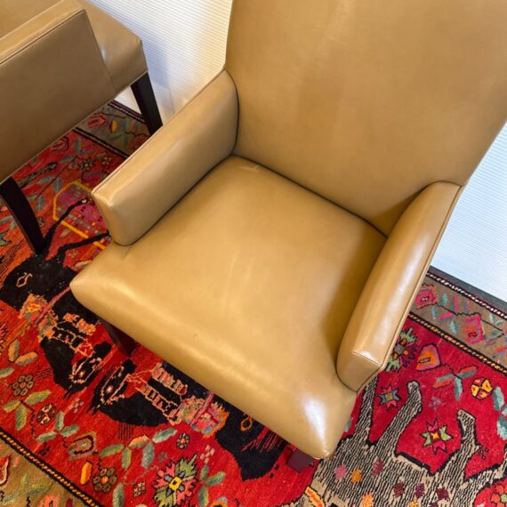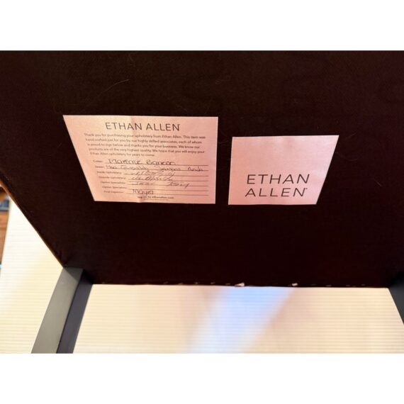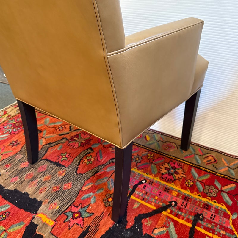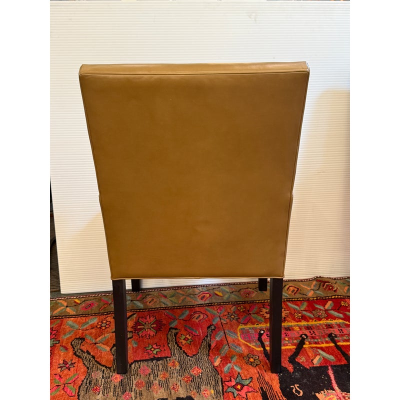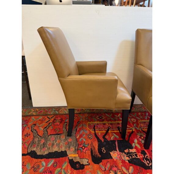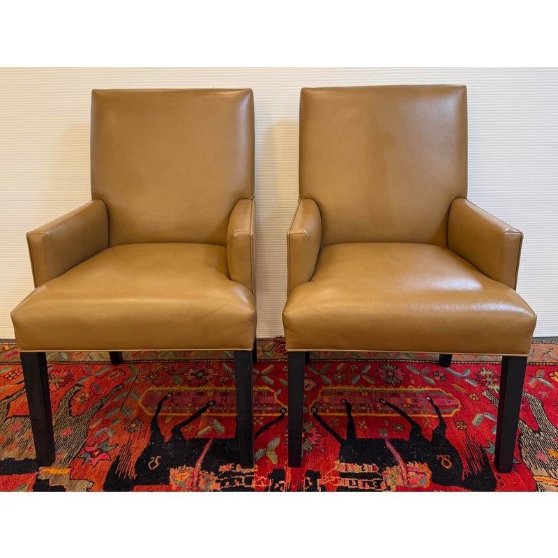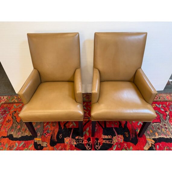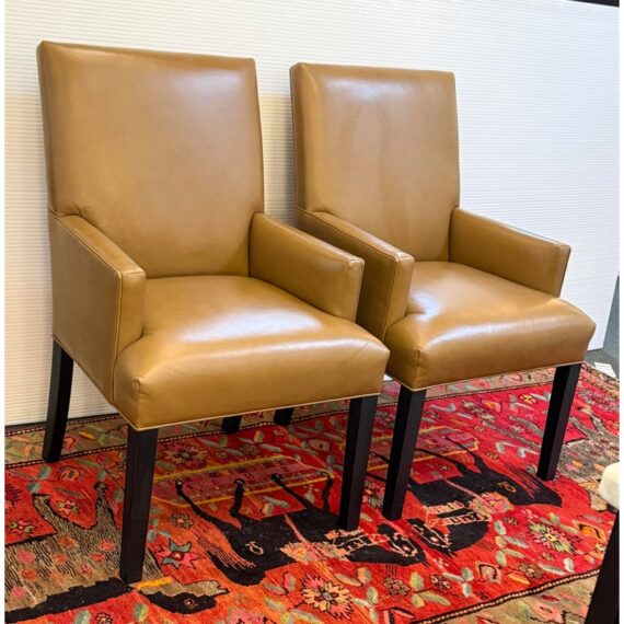 Design Plus Gallery presents a Pair of Thomas Leather Arm Chairs from Ethan Allen. Brings comfort and modern polish to any dining setting. Upholstered in a cognac leather, its clean, contemporary silhouette is defined by a tailored tight back, an attached seat, and graceful tapered legs. Plush foam-and-fiber cushions deliver long-lasting comfort, while the kiln-dried solid hardwood frame ensures durability for years of gatherings. In good condition, visible pen markings on leather and minimal wear from usage. Made in USA.
