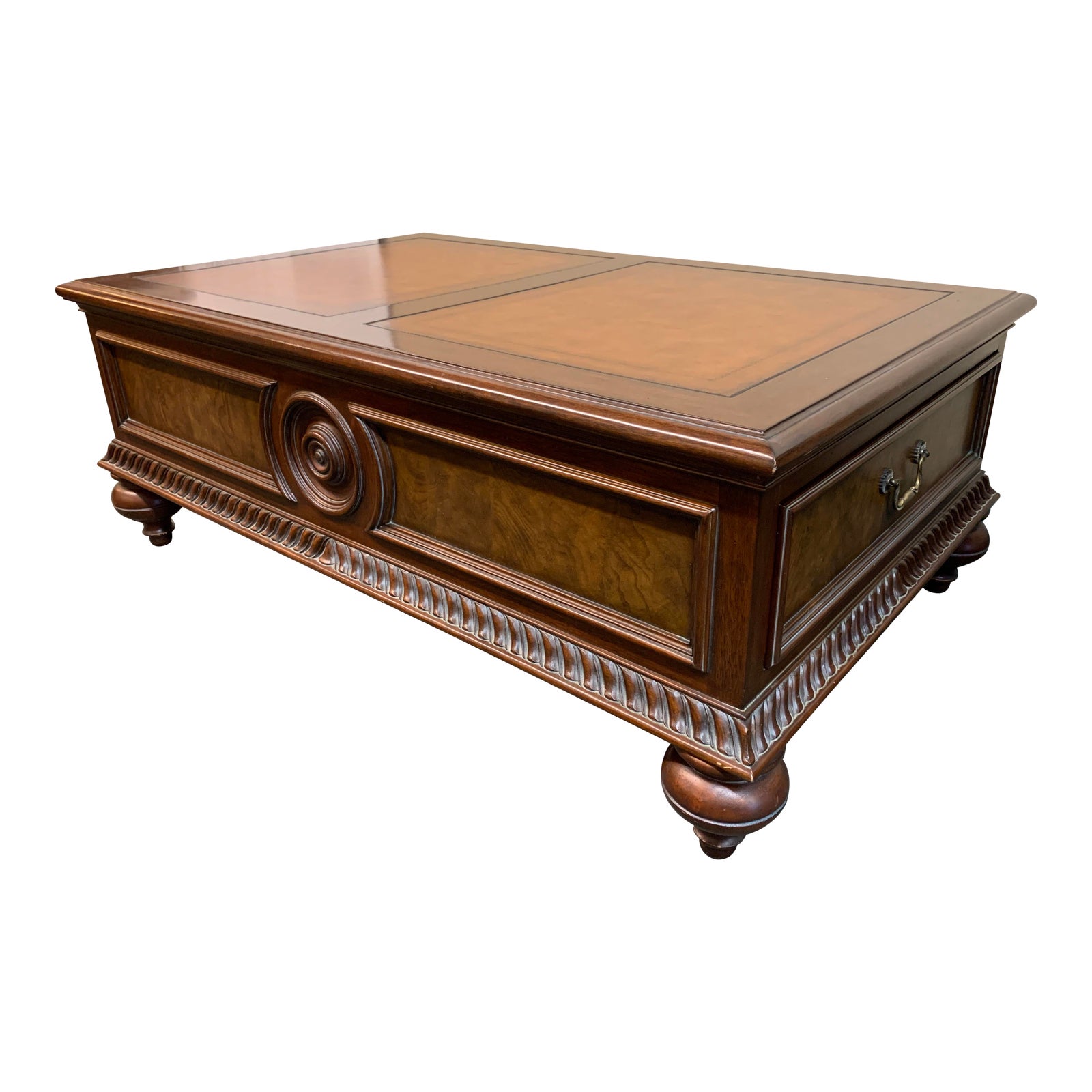 Design Plus Gallery presents an Ethan Allen Townhouse Coffee Table. Turned legs support this large storage coffee table. Oiled brass pulls on each side reveal to open convenient storage opportunities. Molding and leather like top give an old world library feel to this warm and inviting coffee table. Minor wear on surfaces.