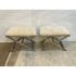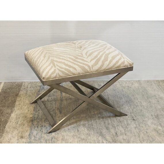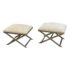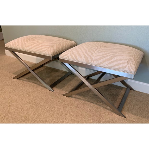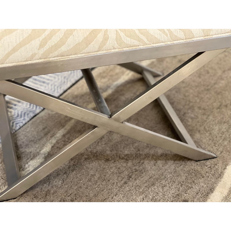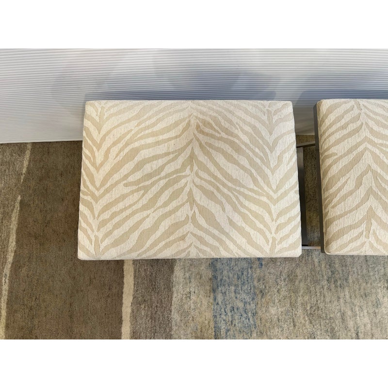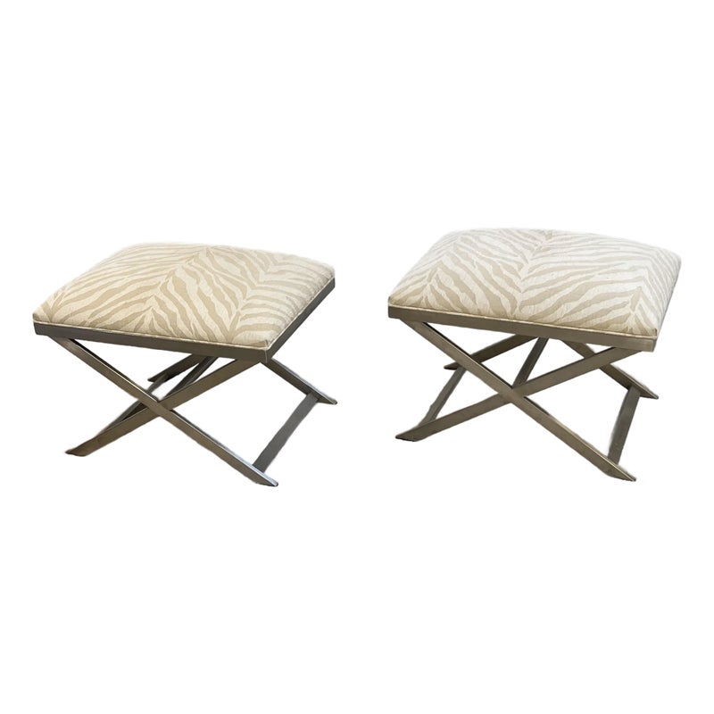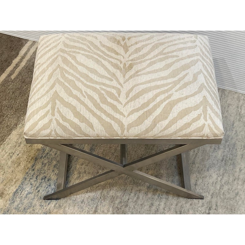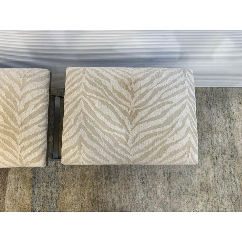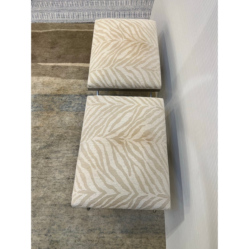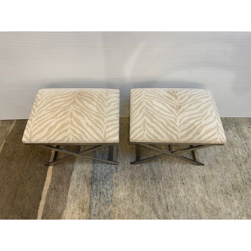 Design Plus Gallery presents a pair of Xanadu Ottomans by Ethan Allen. The contemporary x-base silhouette, finished in brushed stainless steel, is complemented by the subdued animal print upholstery and plush cushioning. The elegant transitional ottomans seamlessly integrate into various settings, including bedrooms, dining rooms, and entryways. Light surface wear; condition is good for age and use.