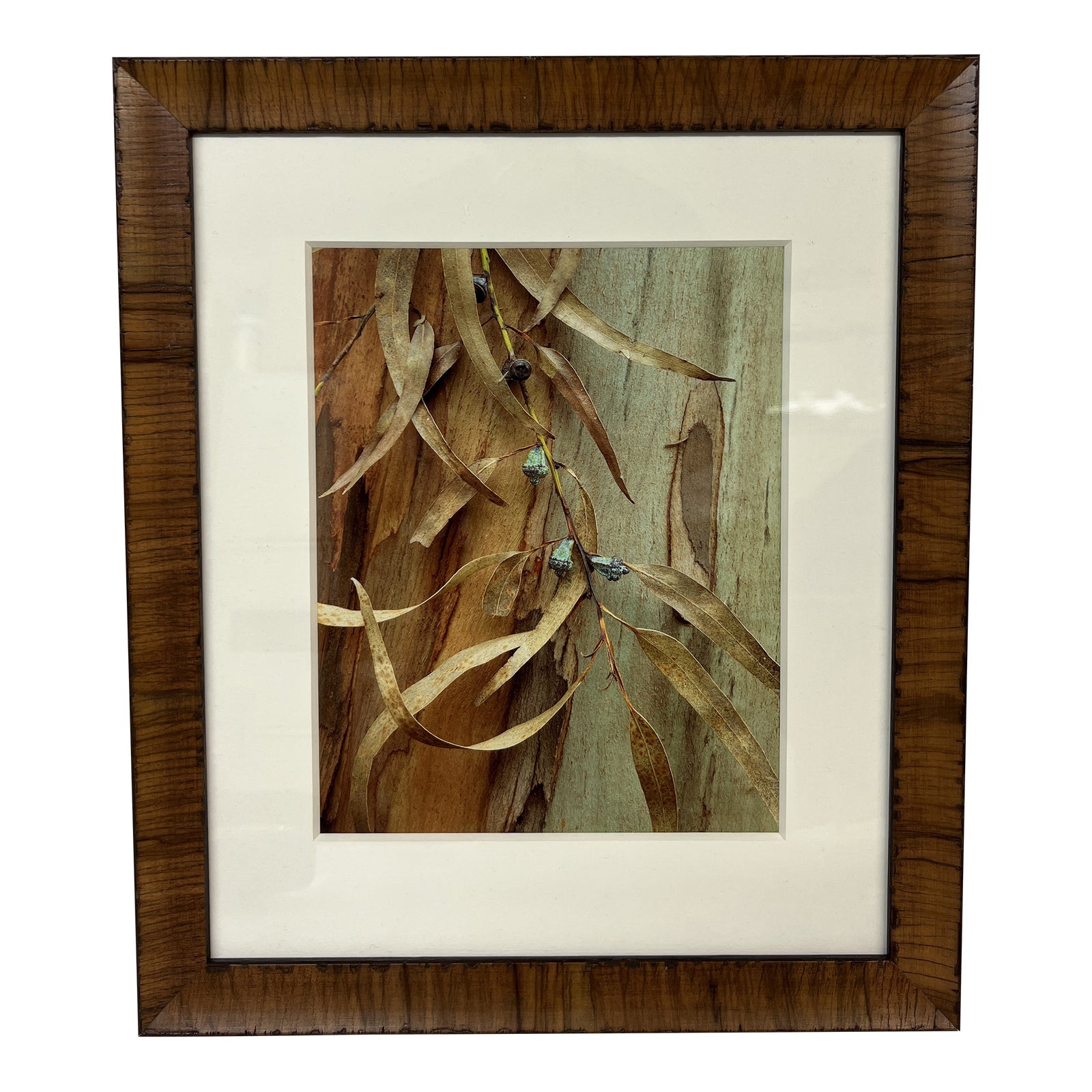 Design Plus Gallery presents a Eucalyptus Photograph, professionally framed. The close up of the withering and dried branch beautifully contrasts the turquoise of the see pod, all against the peeling bark of the Eucalyptus Tree. Matted and professionally framed in wood, protected with glass. Little evidence of wear; overall good condition.